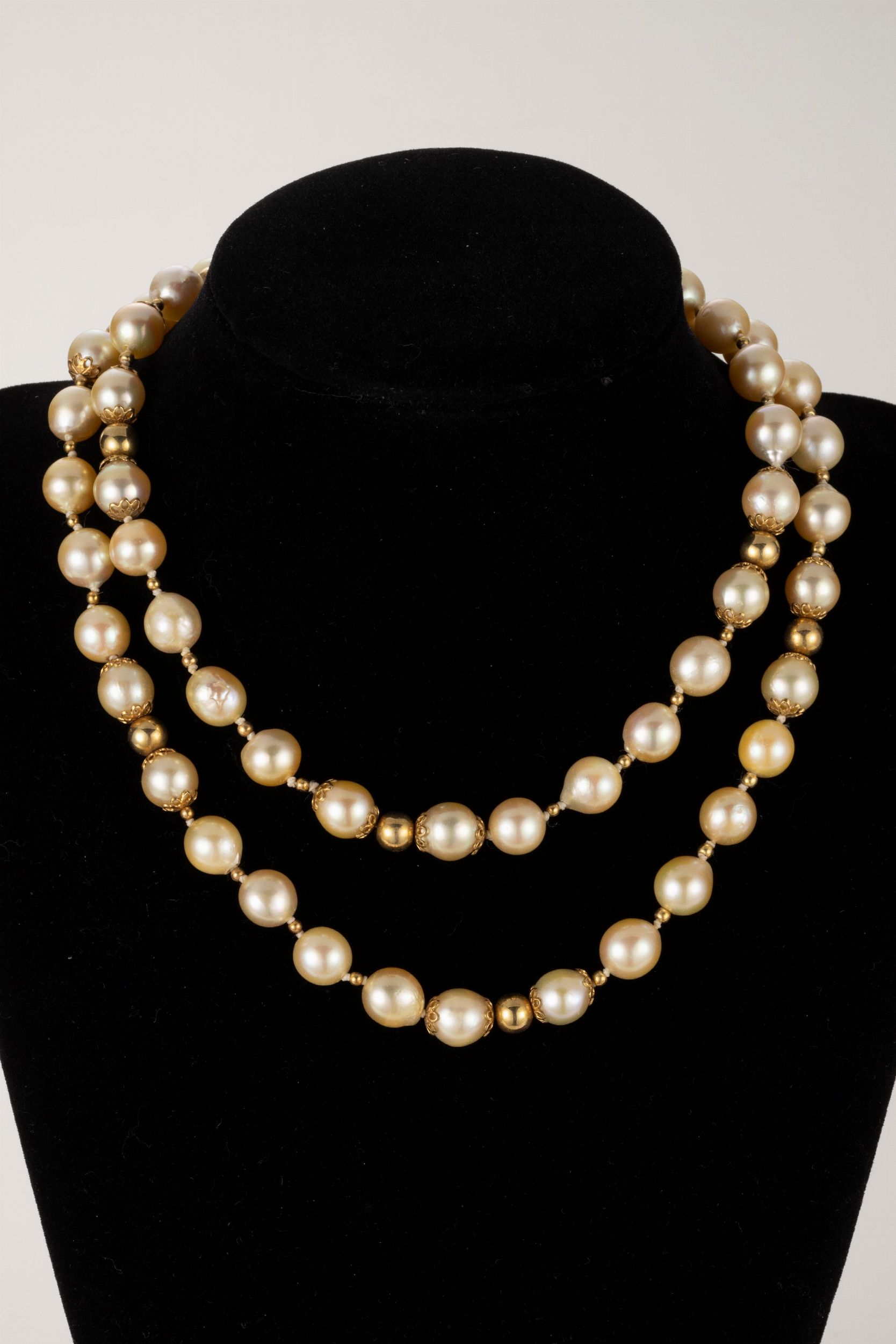Perle alternate da sfere e coppette traforate in oro giallo, chiusura a sfera in oro 18 kt, lunghezza cm 71, perle mm 8 ø.