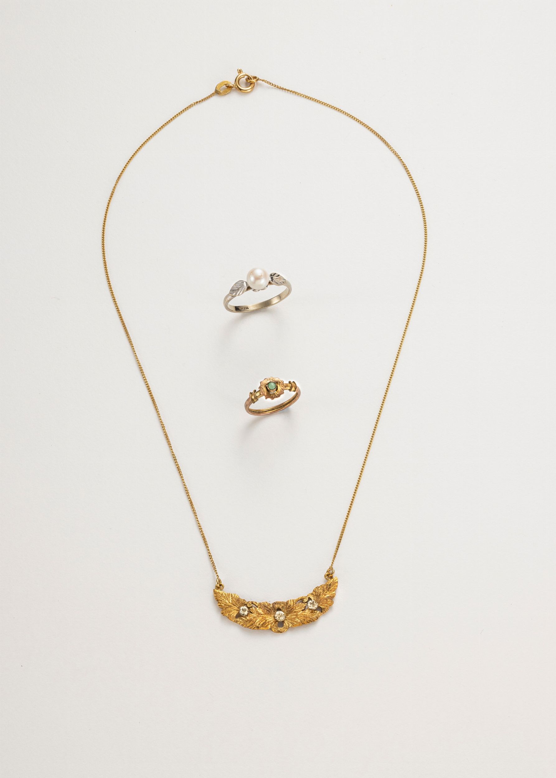 Collana in oro giallo 18 kt; anello in oro bianco 18 kt con perla; anello in oro a bassa caratura con turchese; g 7 totali.