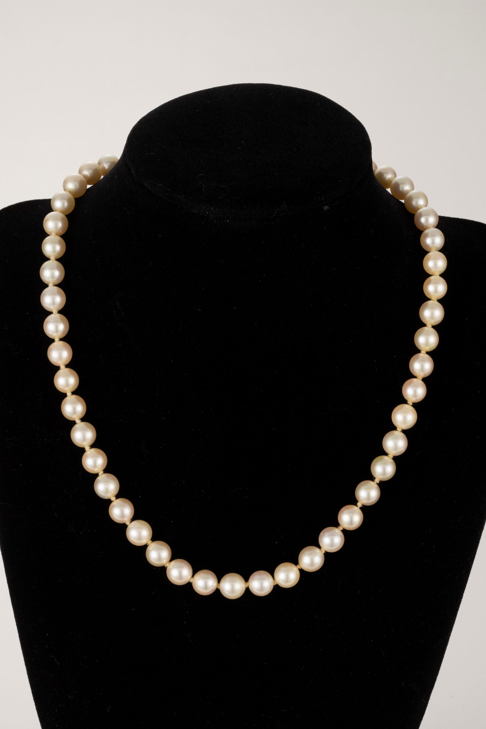 Chiusura in oro giallo 18 kt, lunghezza cm 41, perle mm 7 ø.