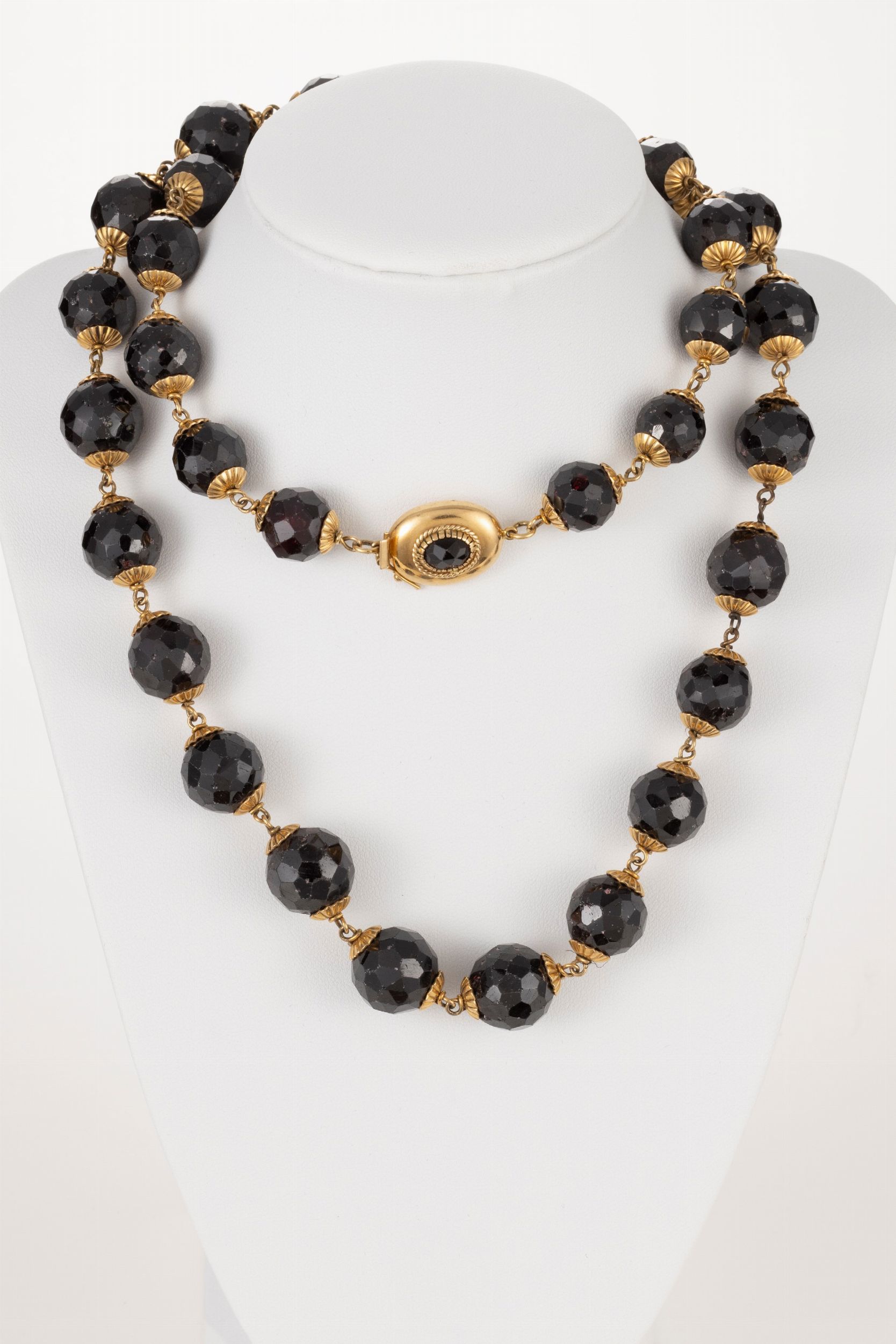 Sfere in onice sfaccettato concatenate con maglie e coppette in oro, chiusura ovale in oro giallo, lunghezza cm 78, onice mm 15 ø.