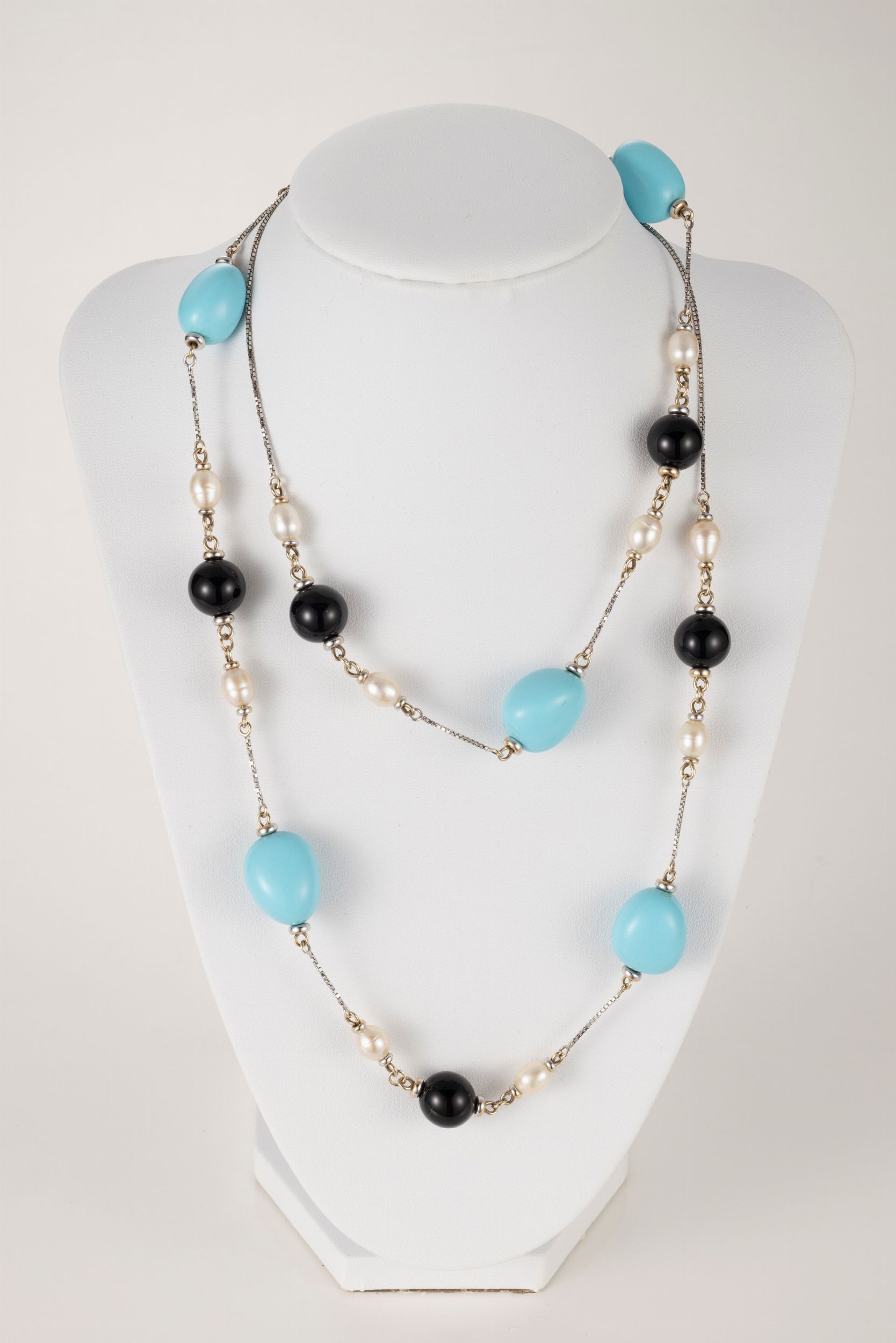 Sottile catenina in oro bianco alternata da boulle ovoidali in pasta di turchese, sfere di onice e perle barocche di fiume, oro 18 kt, lunghezza cm 95, g 60 ca.