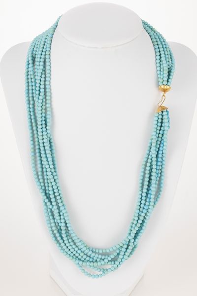 Otto fili, chiusura in oro giallo 18 kt, lunghezza cm 52, turchesi mm 3 ø, g 54.