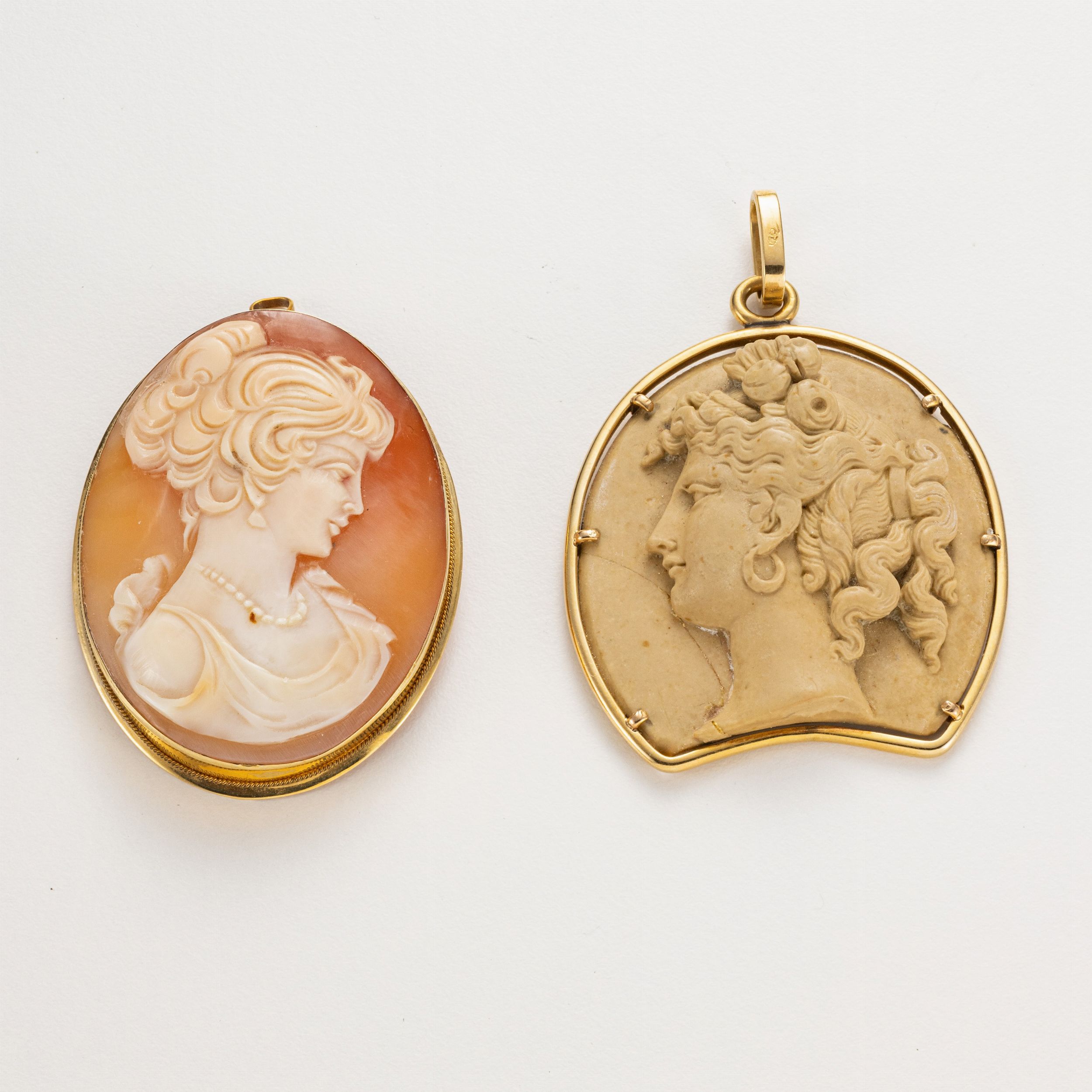Uno con conchiglia e cornice in oro 18 kt, e uno in pietra lavica con cornice in oro (con difetto), entrambi raffiguranti volto femminile.