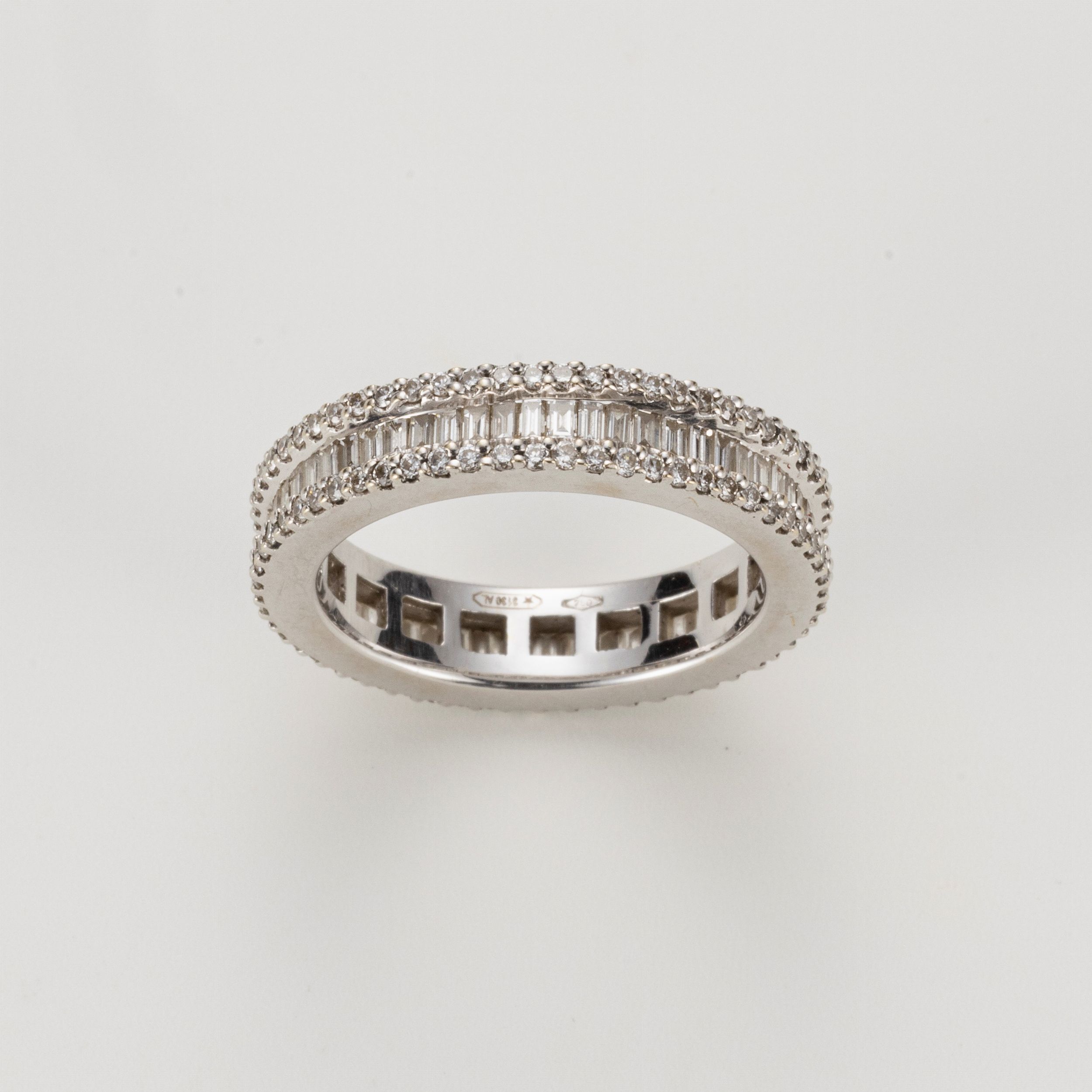 Tre file di diamanti, taglio baguette al centro e taglio brillante ai lati, oro 18 kt, diamanti ct 1,50 ca. totali, misura 14, g 6,1 ca.