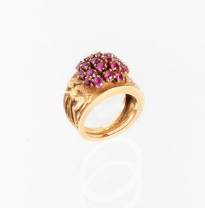 Fascia con figure in rilievo e corolla di piccoli rubini al centro, oro 18 kt, misura 14, g 8,3.