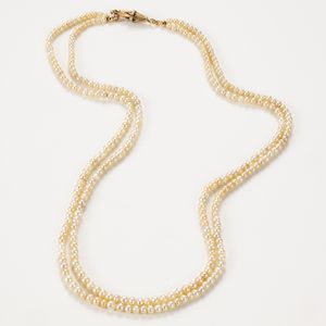 Due fili di perle, chiusura in oro giallo 14 kt, lunghezza cm 47, perle mm 3,5 ø.