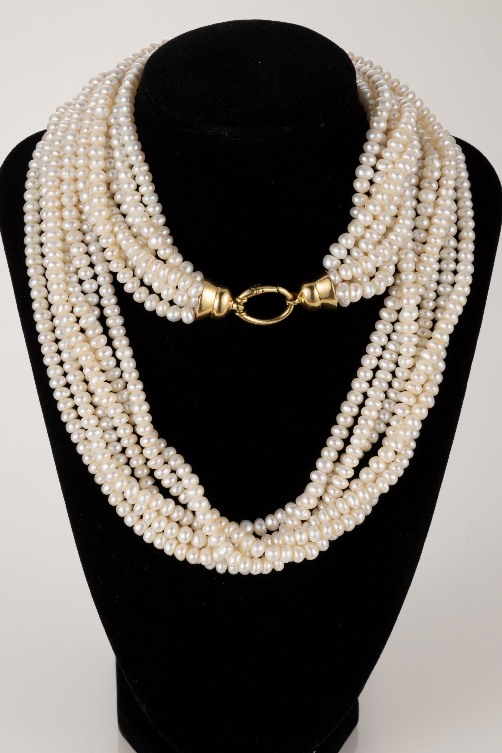 Chiusura a moschettone in oro giallo, oro 18 kt, lunghezza cm 79, perle mm 5,5 ø.