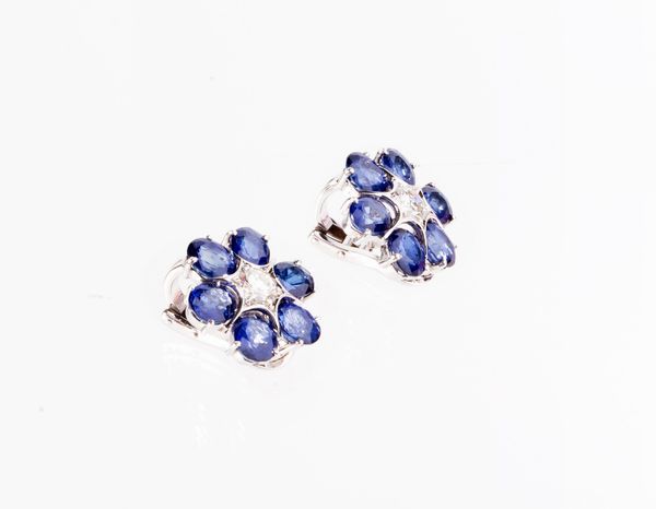 Diamanti taglio brillante al centro e zaffiri ovali, oro 18 kt, orecchini cm 1,8 ø, diamanti ct 0,60 ca., zaffiri ct 4,50 ca., g 9.