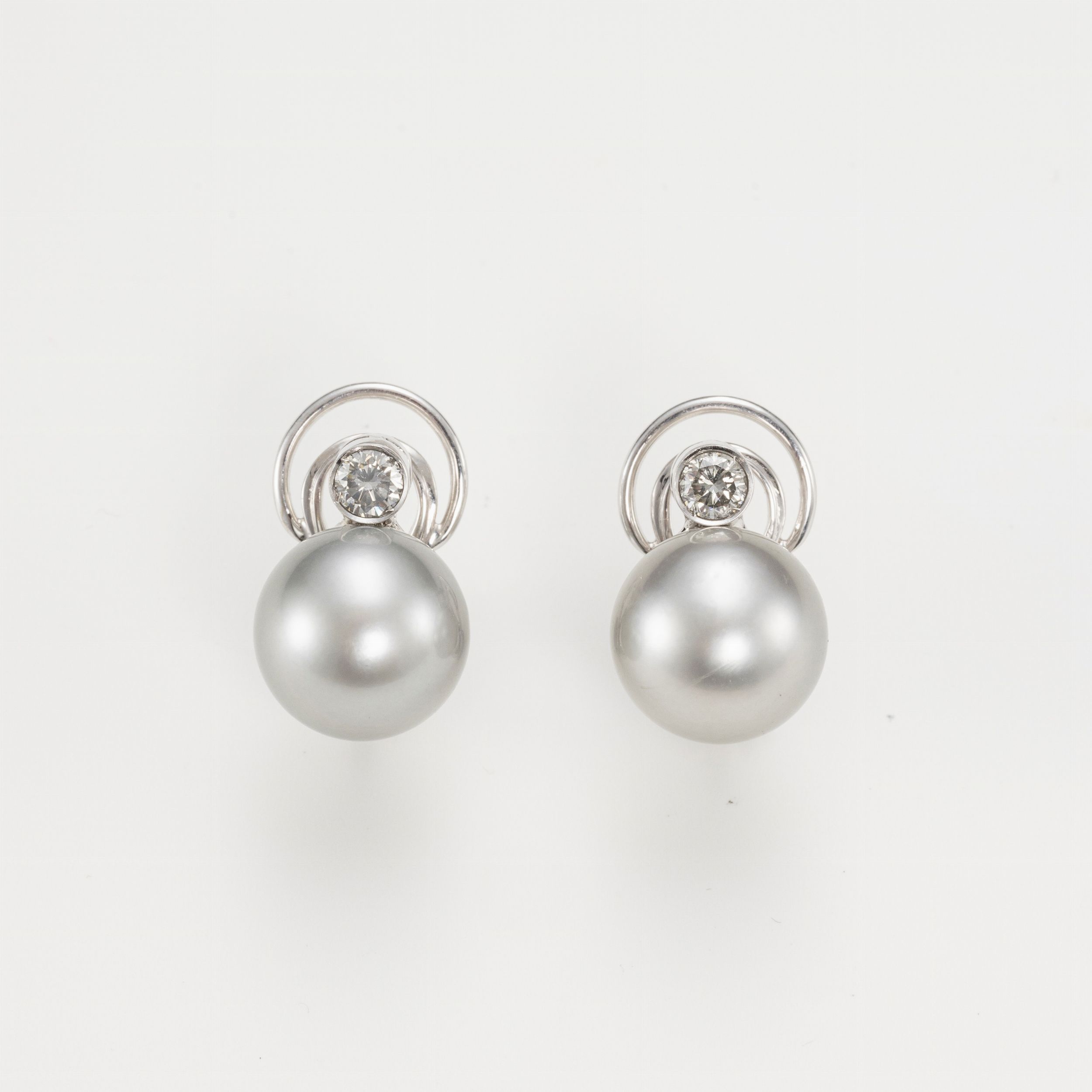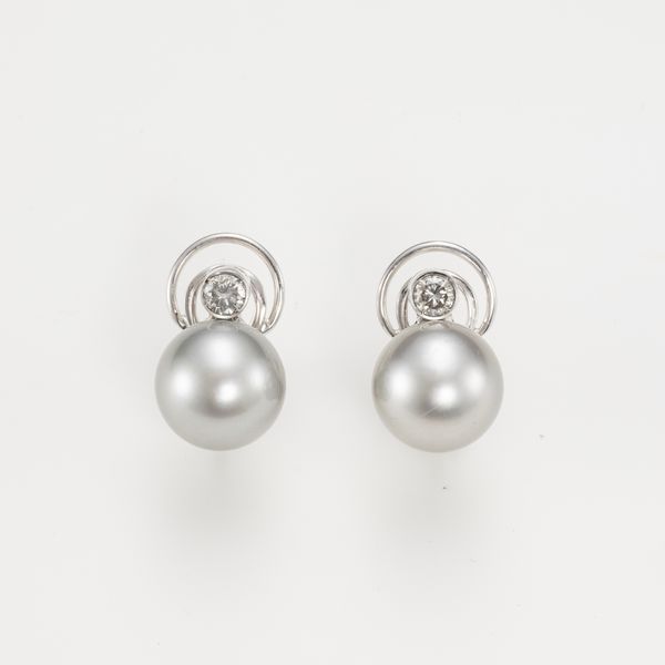 Ogni perla sormontata da un diamante taglio brillante, oro 18 kt, diamanti ct 0,30 ca., perle mm 12 ø, g 11.