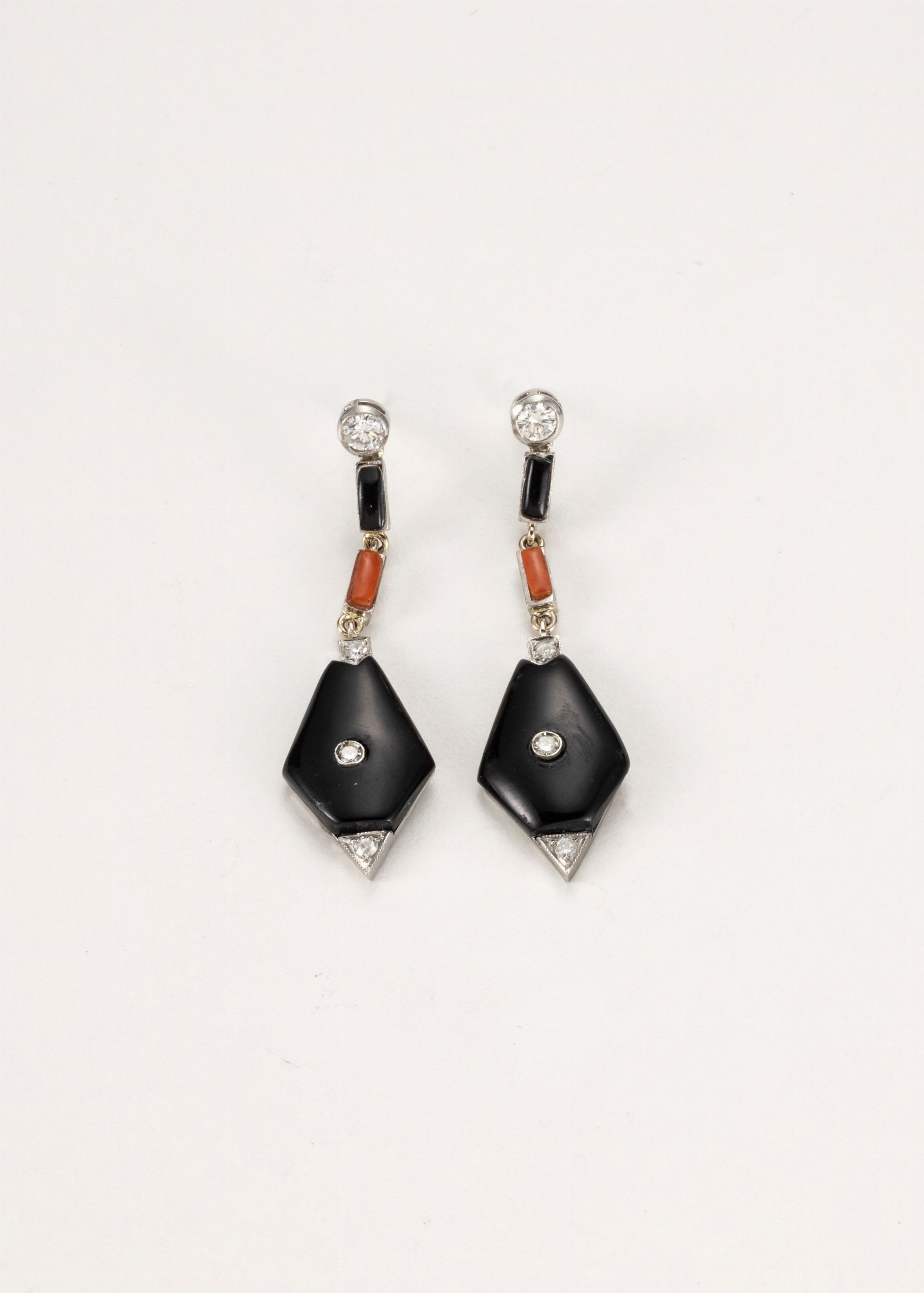 Orecchini pendenti in oro bianco con onice, corallo e diamanti