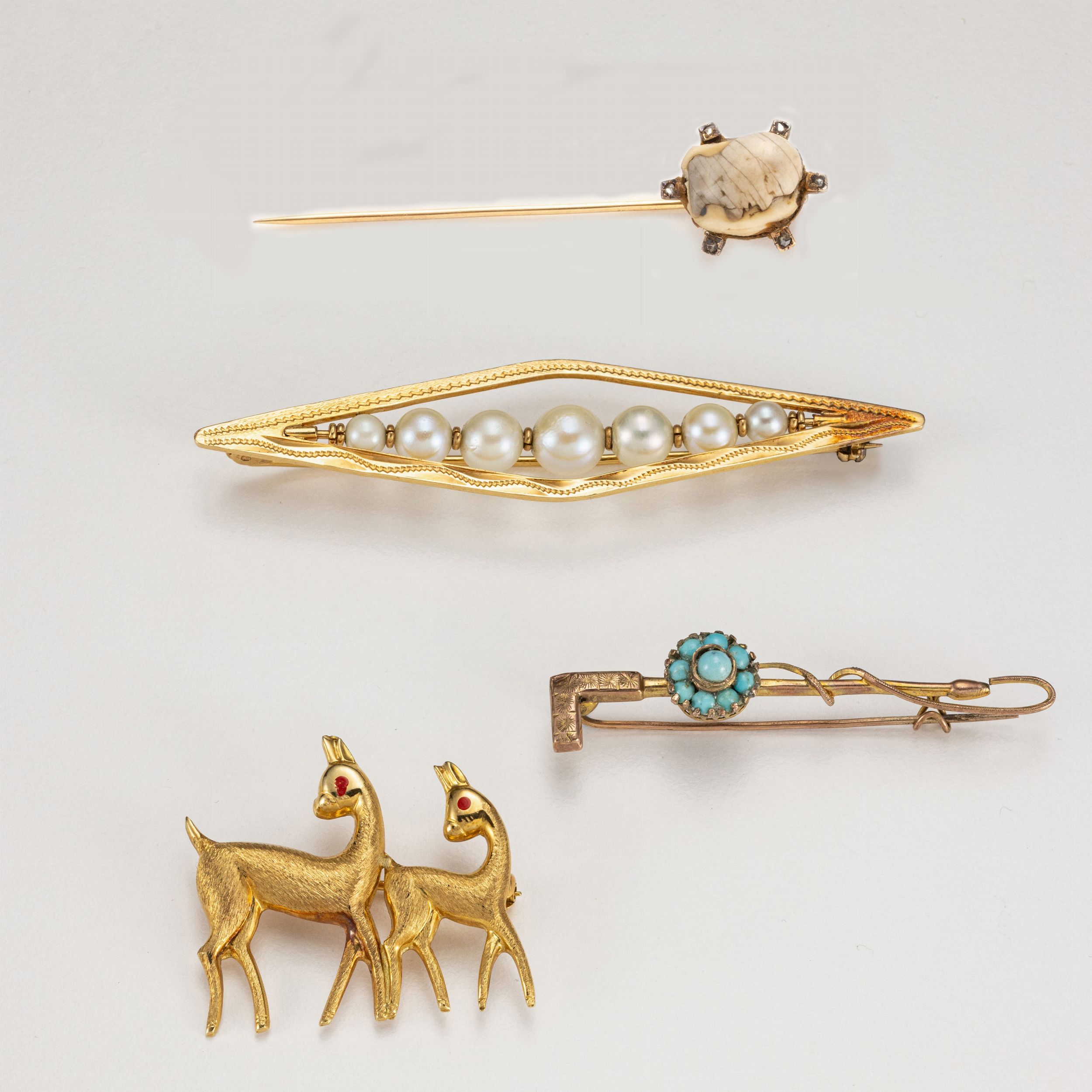 Quattro spille in oro giallo con perle, turchesi e rose di diamante