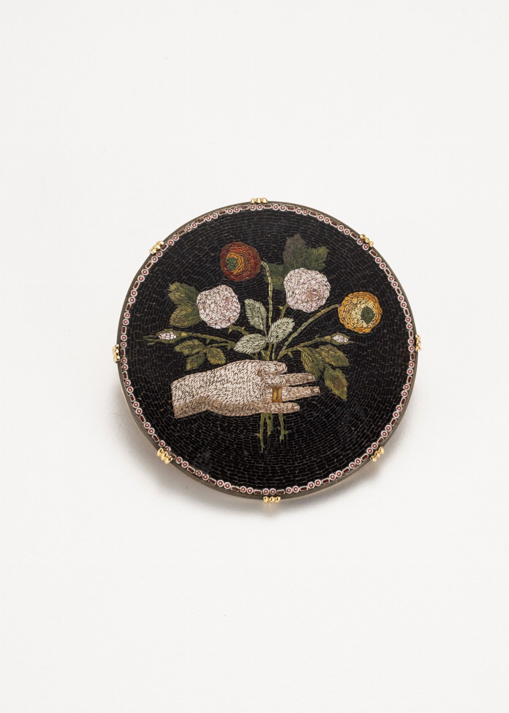 Decoro con mano e mazzo di fiori, oro 18 kt, cm 4,7 ø.