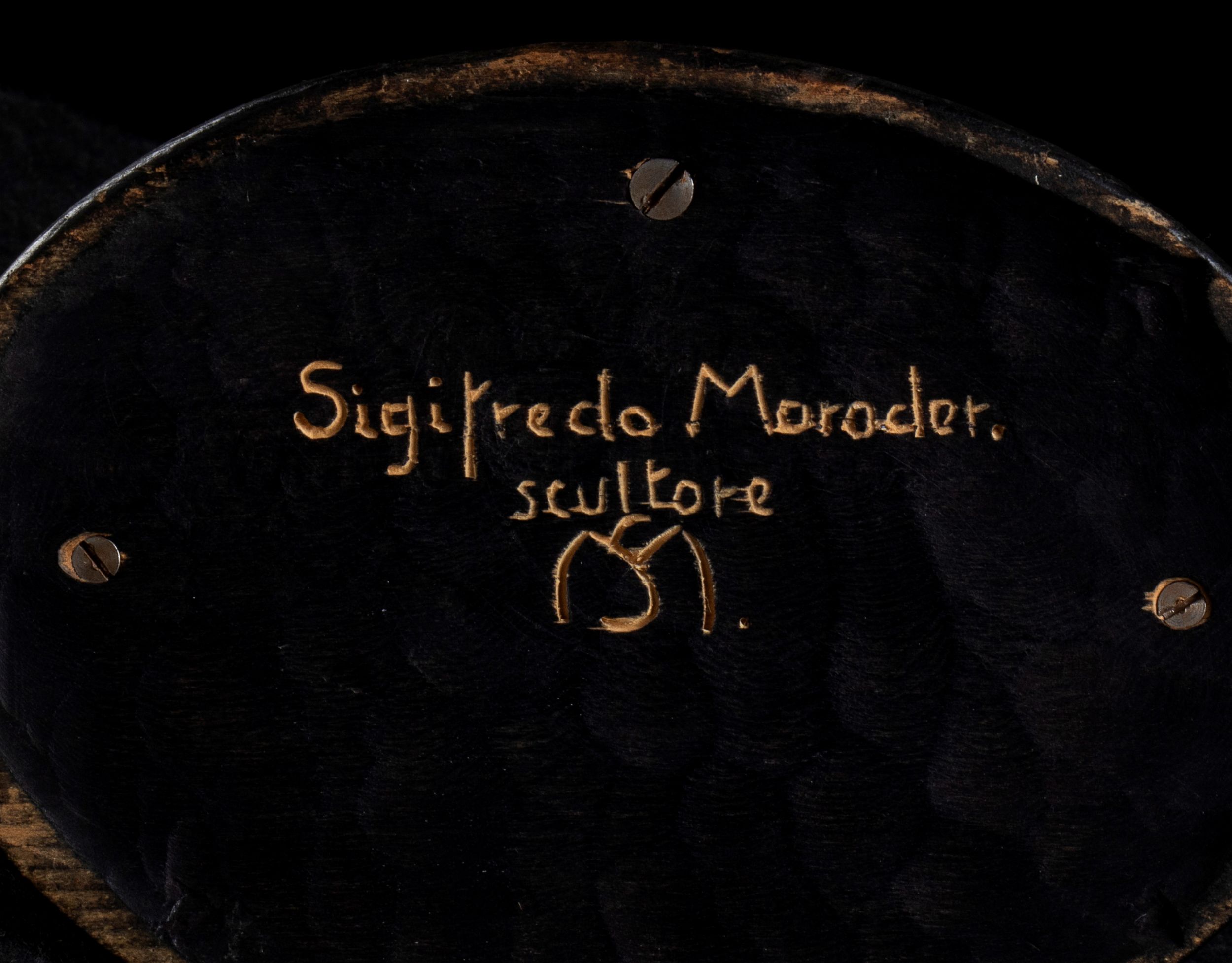 Fine anni 1930 A patina bionda su base in legno tinto nero Figlio d'arte e nipote di Josef Moroder, si distingue nella scultura, soprattutto di arte sacra Firmato e monogrammata sotto la base