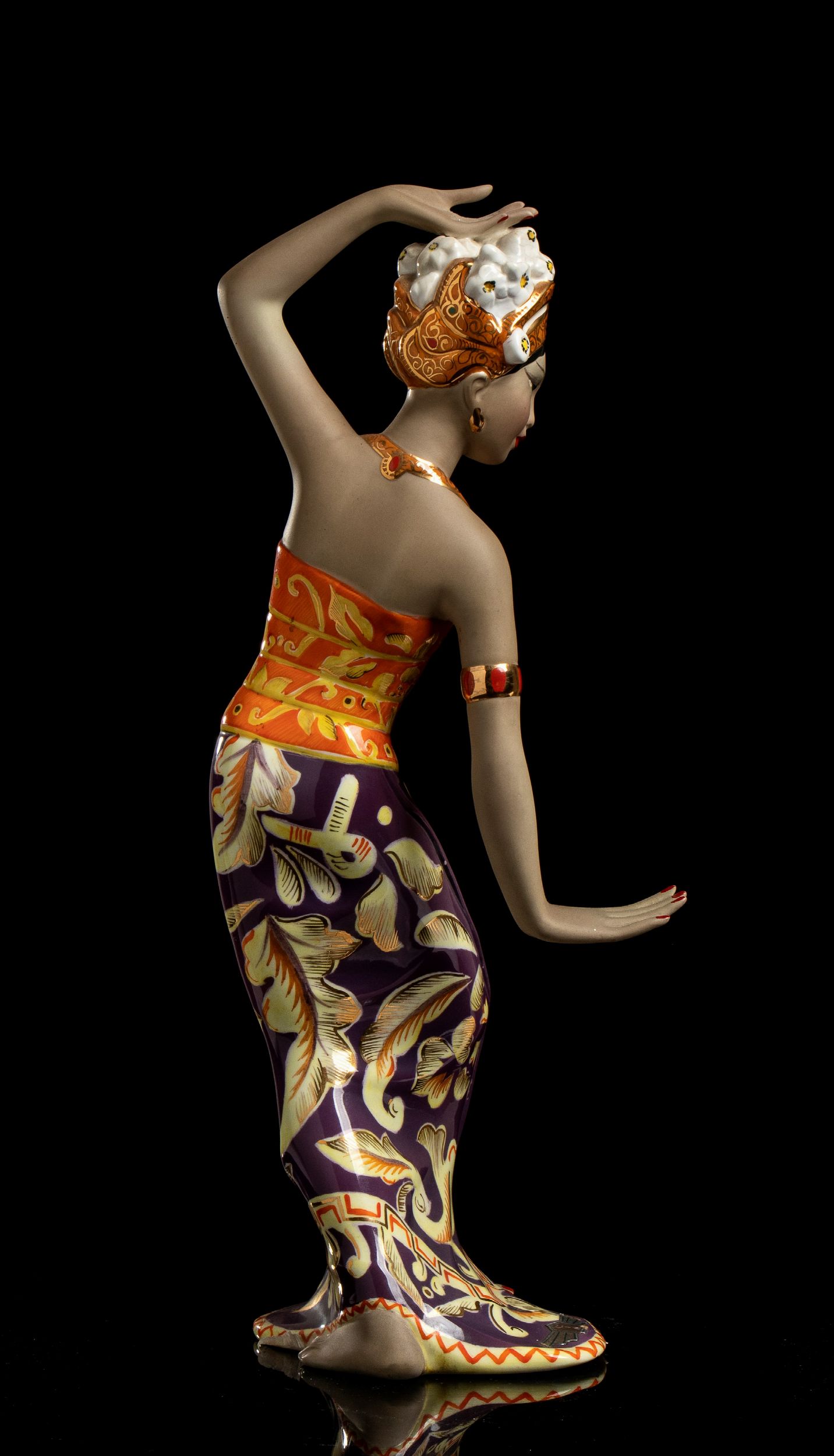 Ceramica policroma, 35,5 x 11,5 x 11 cm ca. Anni 1950 Questa opera rappresenta il valido tentativo da parte della manifattura CIA della sig.ra Manna di individuare una propria cifra stilistica discostandosi dai modelli e dalla produzione Lenci Marchio della fabbrica e numero di serie in vernice nera sotto smalto alla base