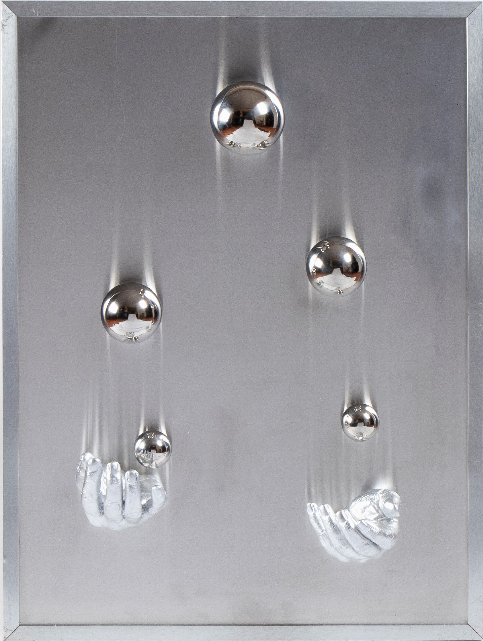 Acciaio lavorato e applicato su tavola, cm. 84x63x4