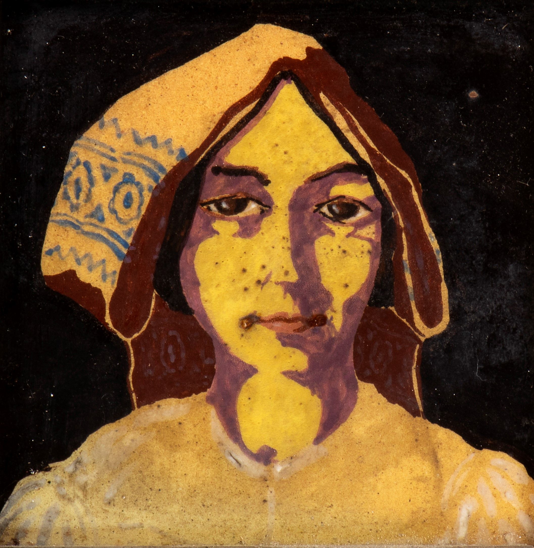 Ceramica policroma, 10 x 10 cm Fine anni 1920 Ceramica dipinta nelle tonalità marrone, ocra, violetto e azzurro sul fondo nero Di evidente derivazione cambellottiana, questa mattonella con molta probabilità appartiene alla produzione del maestro della fine degli anni '20, quando stretto era il sodalizio artistico con Duilio Cambellotti Mattonella firmata con monogramma al recto in basso a destra. Al retro firma manifattura 'Fiamma' di Ferruccio Palazzi in Roma