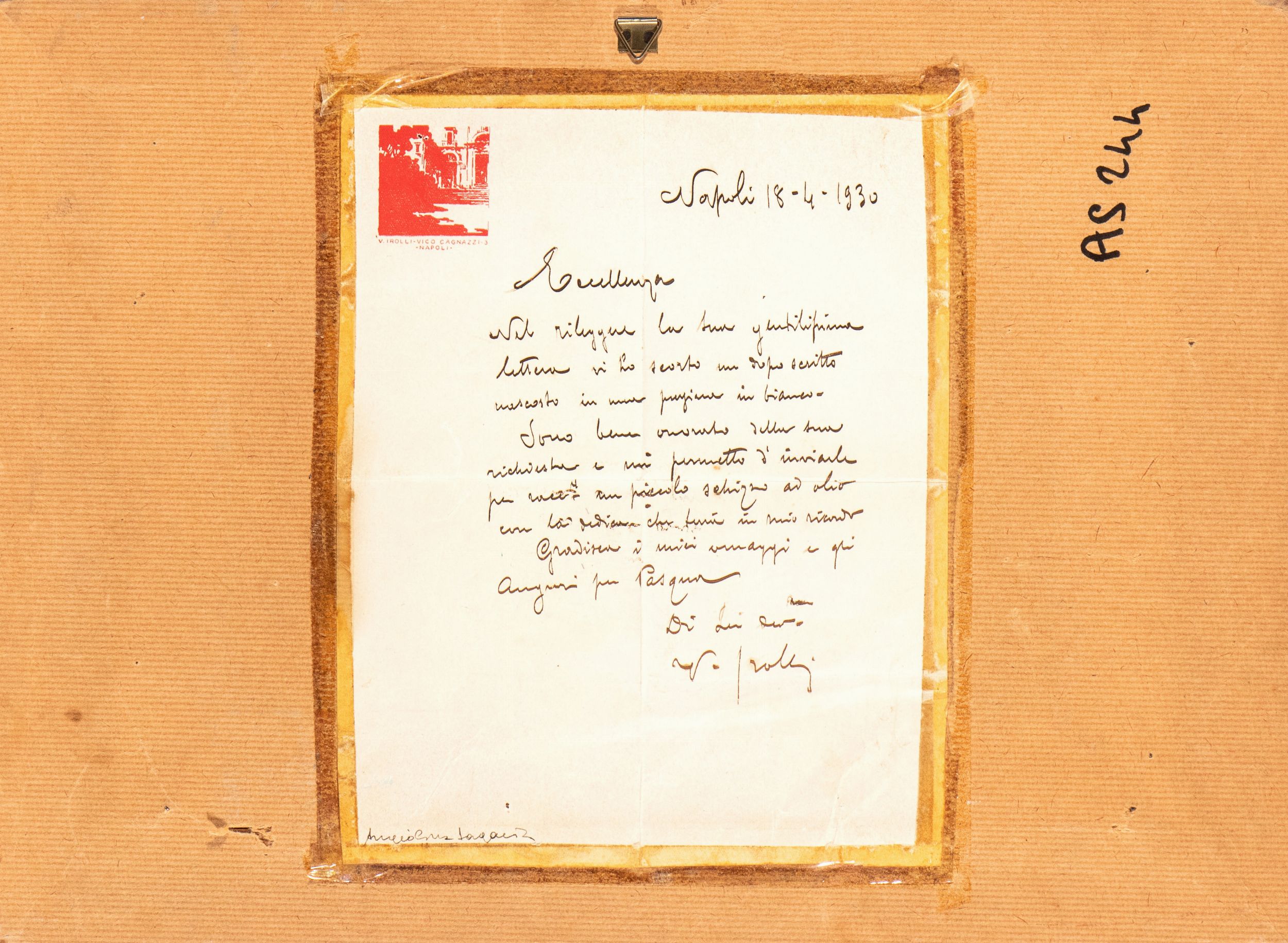 1930 ca. Firmato in basso a destra: Omaggio di V. Irolli. Al retro, una lettera per auguri pasquali firmata V. Irolli e datata Napoli, 18/4/1930 con timbro: V. Irolli, Vico Cagnazzi 3, Napoli