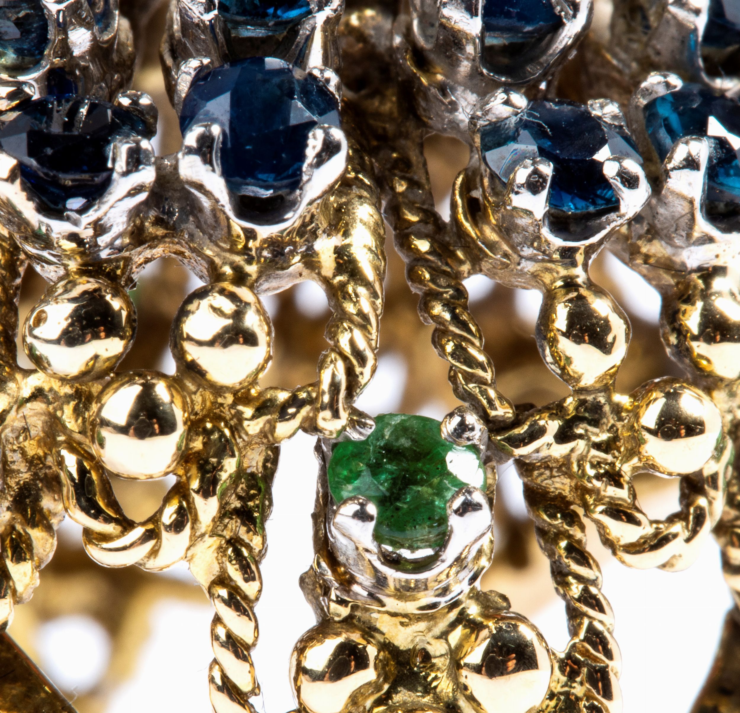 in oro giallo 18k, incastonato con cabochon ovale di corallo cerasuolo (corallium elatius), montatura punteggiata da zaffiri e smeraldi di forma rotonda. N. 30 zaffiri per un peso totale di circa 3.77 ct, e n. 06 smeraldi per un peso totale di circa 0.50 ct, come misurati e classificati nella montatura. Punzonato “18k”. Misura IT 14 - Misura US 7. Peso: 15.7 gr.