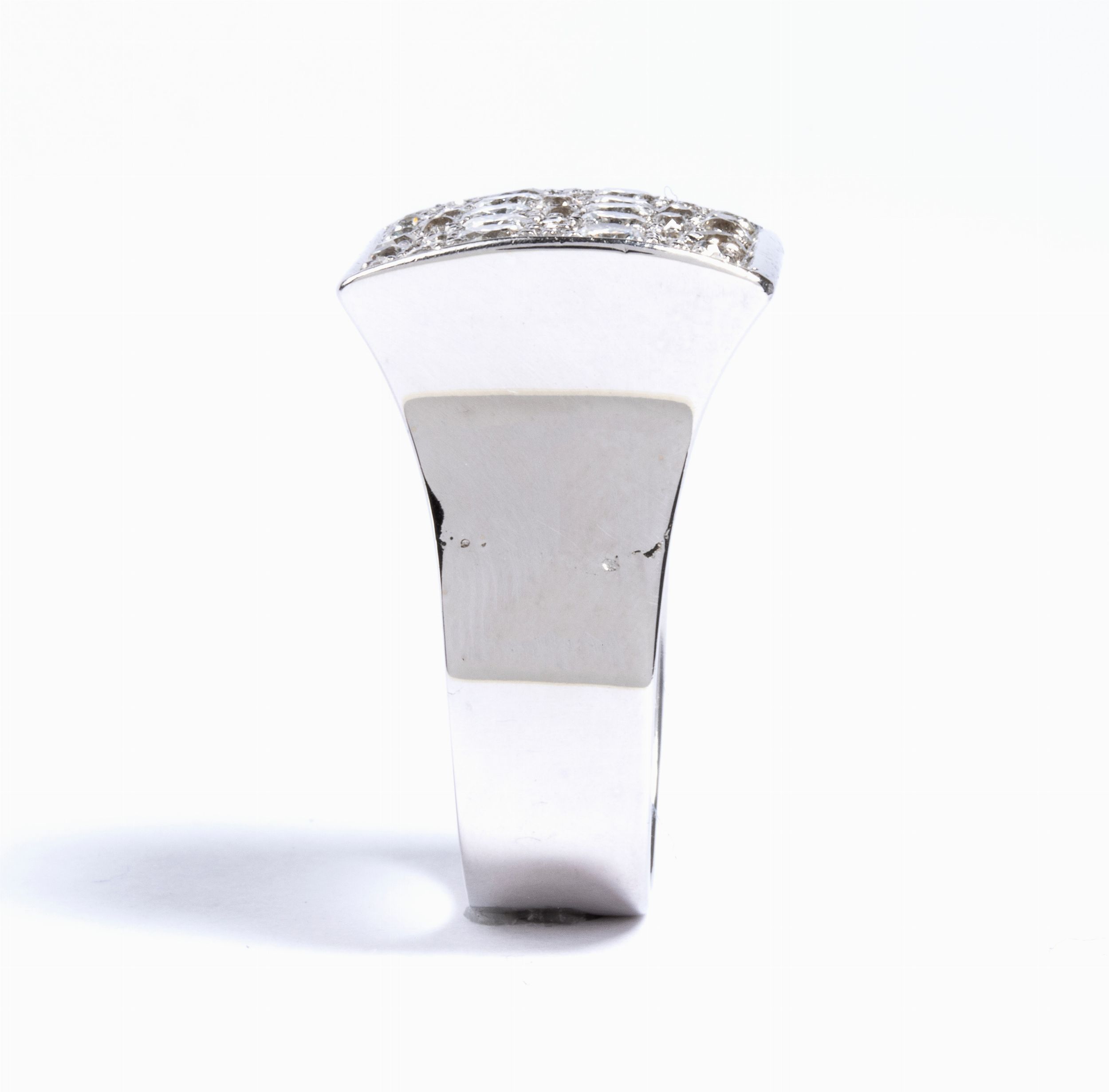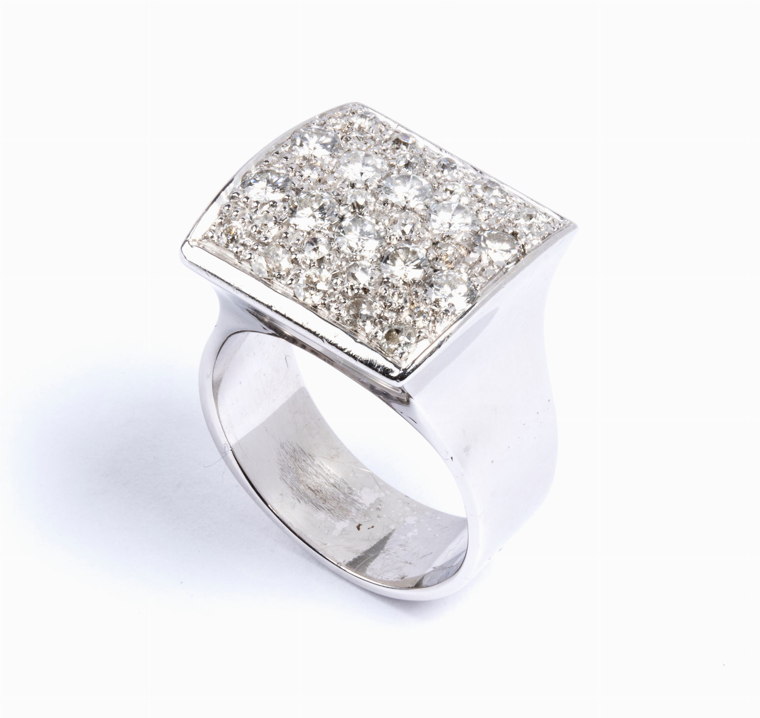 incastonato con pave' di diamanti rotondi taglio vecchio europeo. N. 30 diamanti stimati per un peso totale di circa 2.30 ct, colore G-H, purezza SI, come misurati e classificati nella montatura. Misura IT 14 - Misura US 7. Peso: 13 gr.