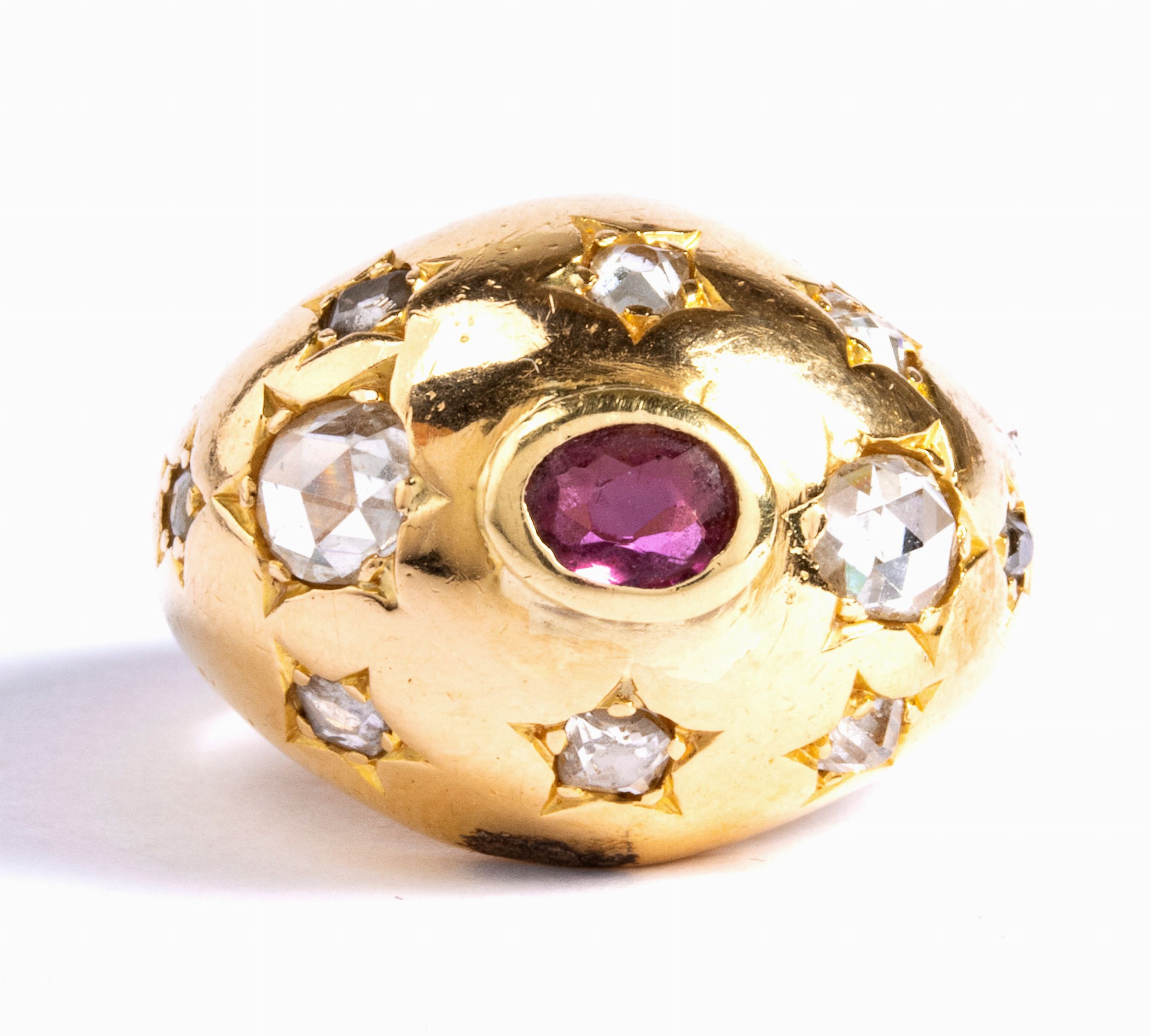 incastonato con rubino centrale di forma ovale contornato da diamanti taglio a rosa e taglio old mine. N. 01 rubino per un peso di circa 0.55 ct, come misurato e classificato nella montatura. Punzonato: marchio di importazione per la Francia dal 2.6.1893. Misura IT 13 1/2 - Misura US 6 3/4. Peso: 10,3 gr.