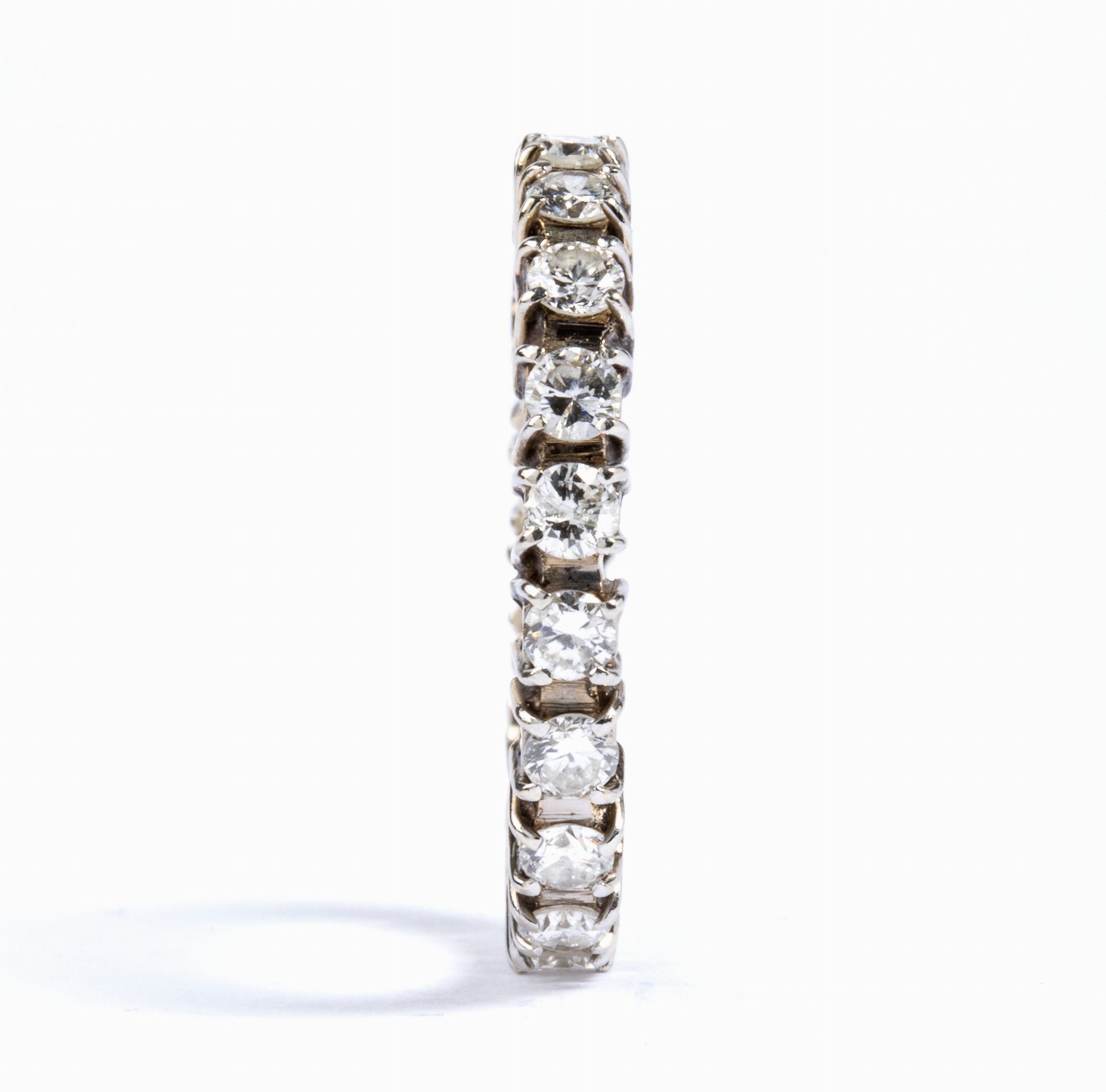 incastonato con linea di diamanti rotondi taglio brillante. N. 18 diamanti stimati per un peso totale di circa 0.55 ct, colore G-H, purezza IF-VVS, come misurati e classificati nella montatura. Misura IT 10 - Misura US 5 1/4. Peso: 3,4 gr.