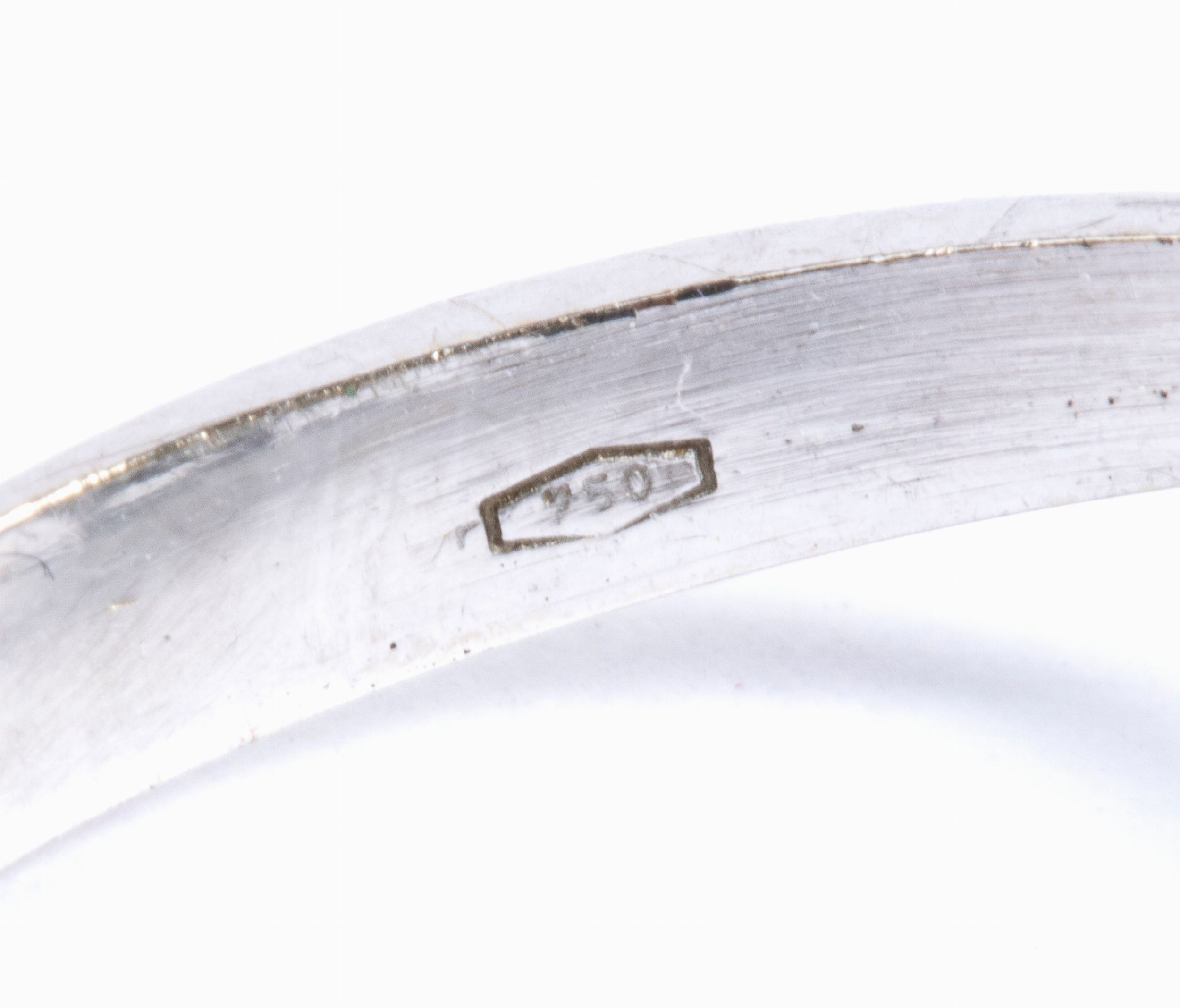 in oro bianco 18k, incastonato con smeraldo ottagonale incorniciato da diamanti taglio brillante. N. 10 diamanti stimati per un peso totale di circa 1.00 ct, colore G- H, purezza SI e n. 01 smeraldo per un peso di circa 1.90 ct, come misurati e classificati nella montatura. Punzonato “750”. Misura IT 14 - Misura US 7. Peso: 4,7 gr.