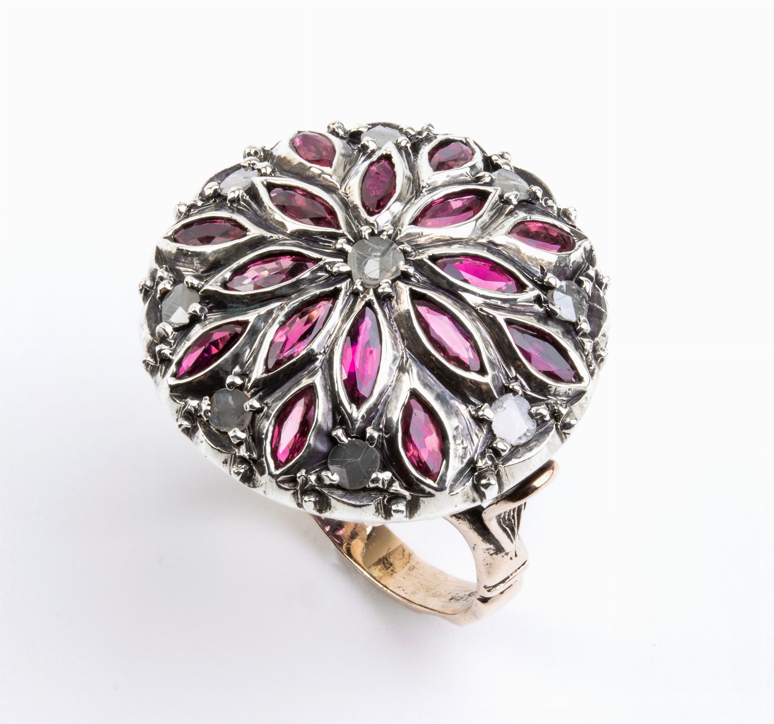 montatura in oro bianco 18k ed argento a motivo floreale, impreziosita da rubini e diamanti. Punzonato '750'. Misura ITA 17 - Misura USA 8. Diametro fronte: 2 cm. Peso; 10,2 gr.