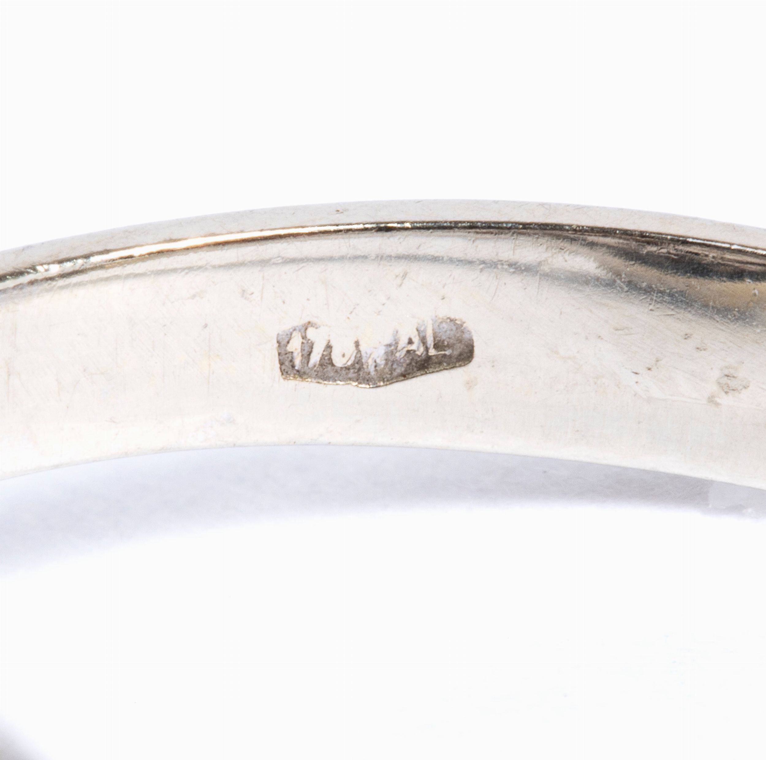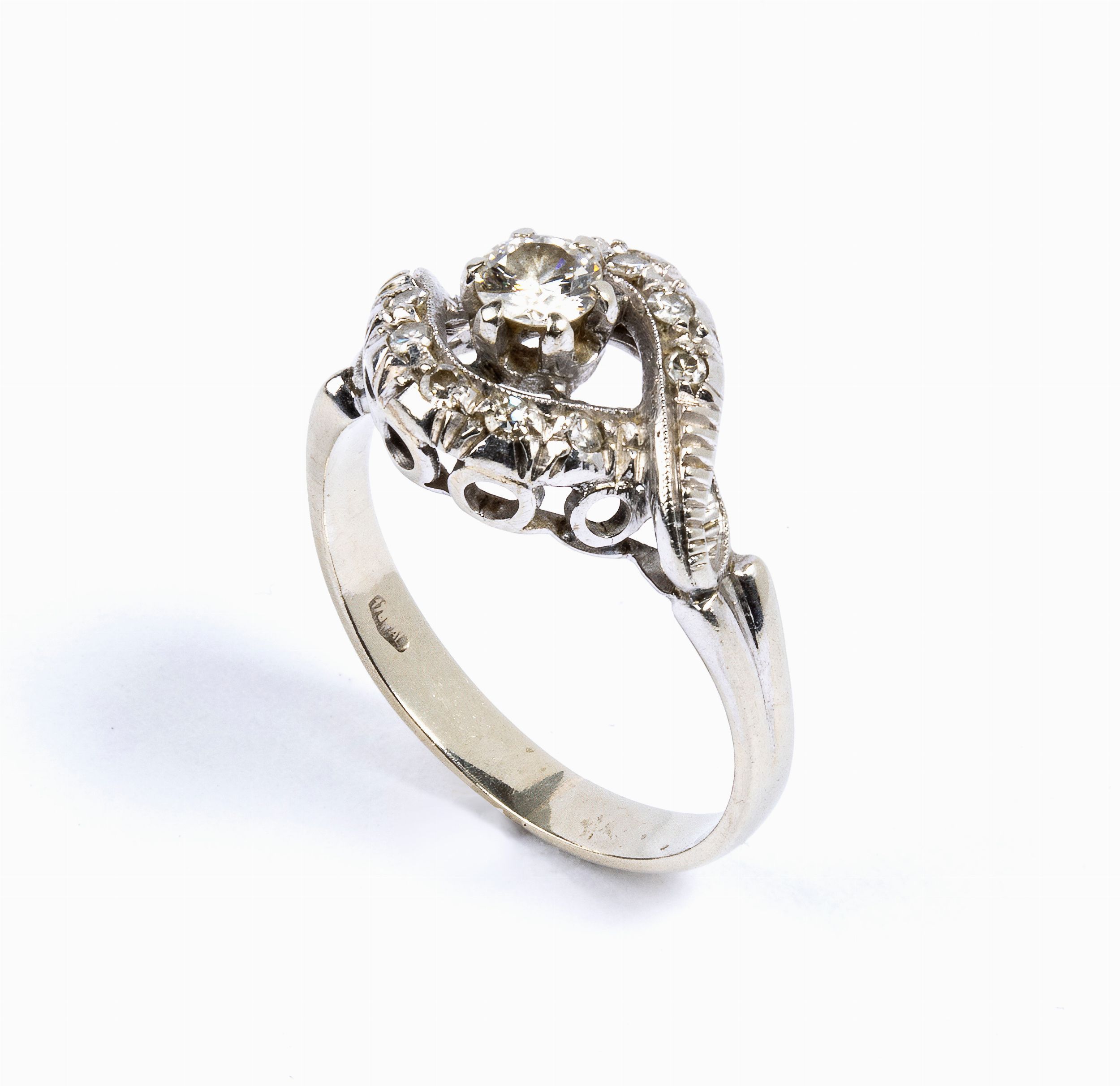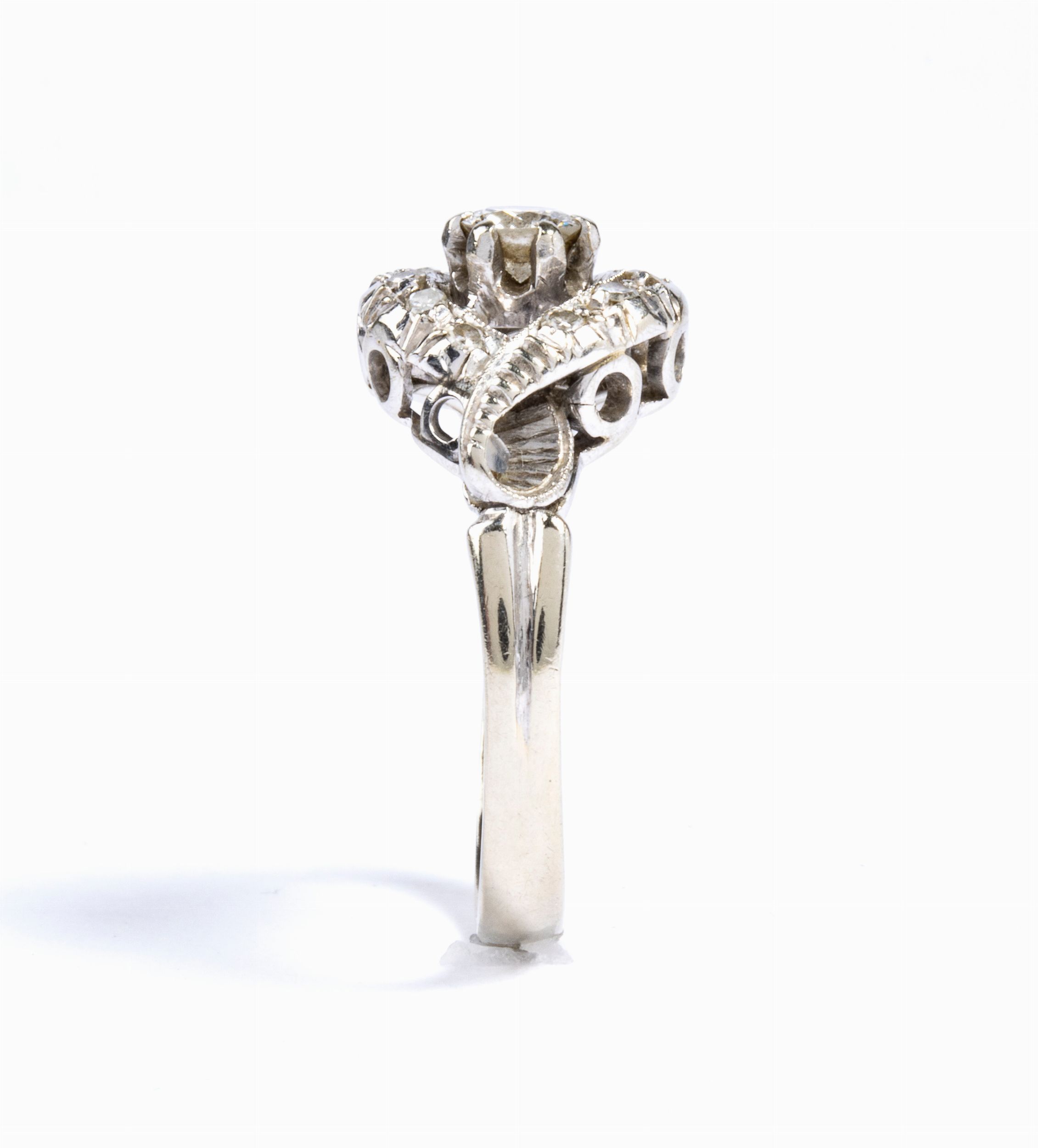 incastonato con diamante centrale taglio brillante contornato da nastri in diamanti taglio huit-huit. Diamante centrale stimato per un peso di circa 0.20 ct, altri diamanti per un peso totale di circa 0.20 ct, colore G-H, purezza VVS- VS, come misurati e classificati nella montatura. Punzonato '170 AL'. Misura IT 12 1/5 - Misura US 6 1/4. Peso: 3,6 gr.