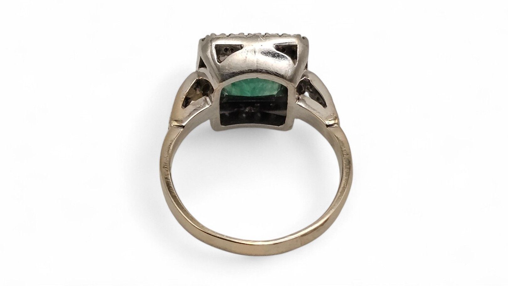 in oro bianco 18k, incastonato con smeraldo tra ciornice di diamanti taglio brillante. N. 28 diamanti stimati per un peso totale di circa 1.00 ct, colore F-G, purezza VVS-VS e n. 01 smeraldo per un peso di circa 2.40 ct, come misurati e classificati nella montatura. Punzonato “750”. Misura IT 15 ½ - Misura US 7 ½. Peso: 6,5 gr.