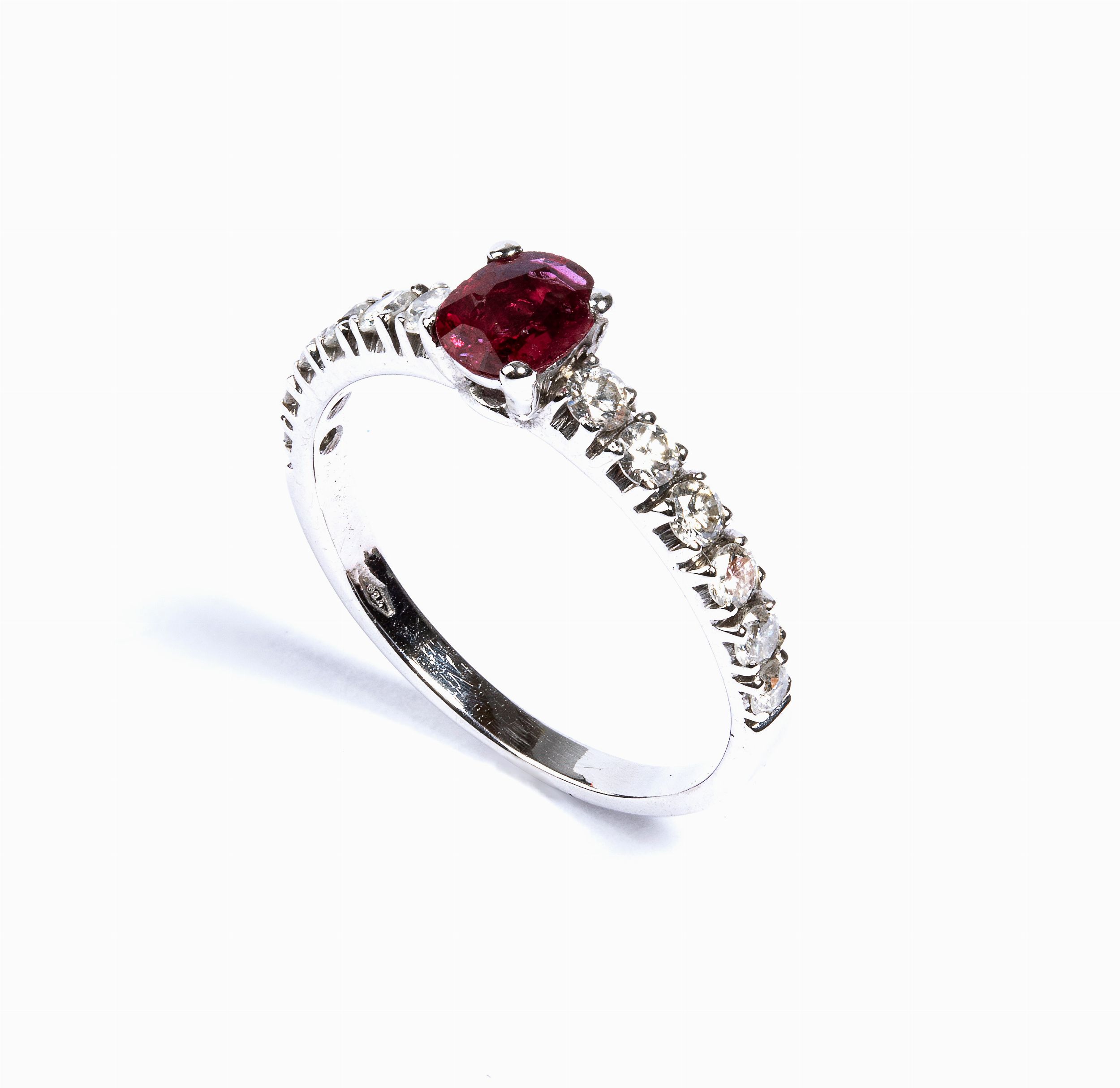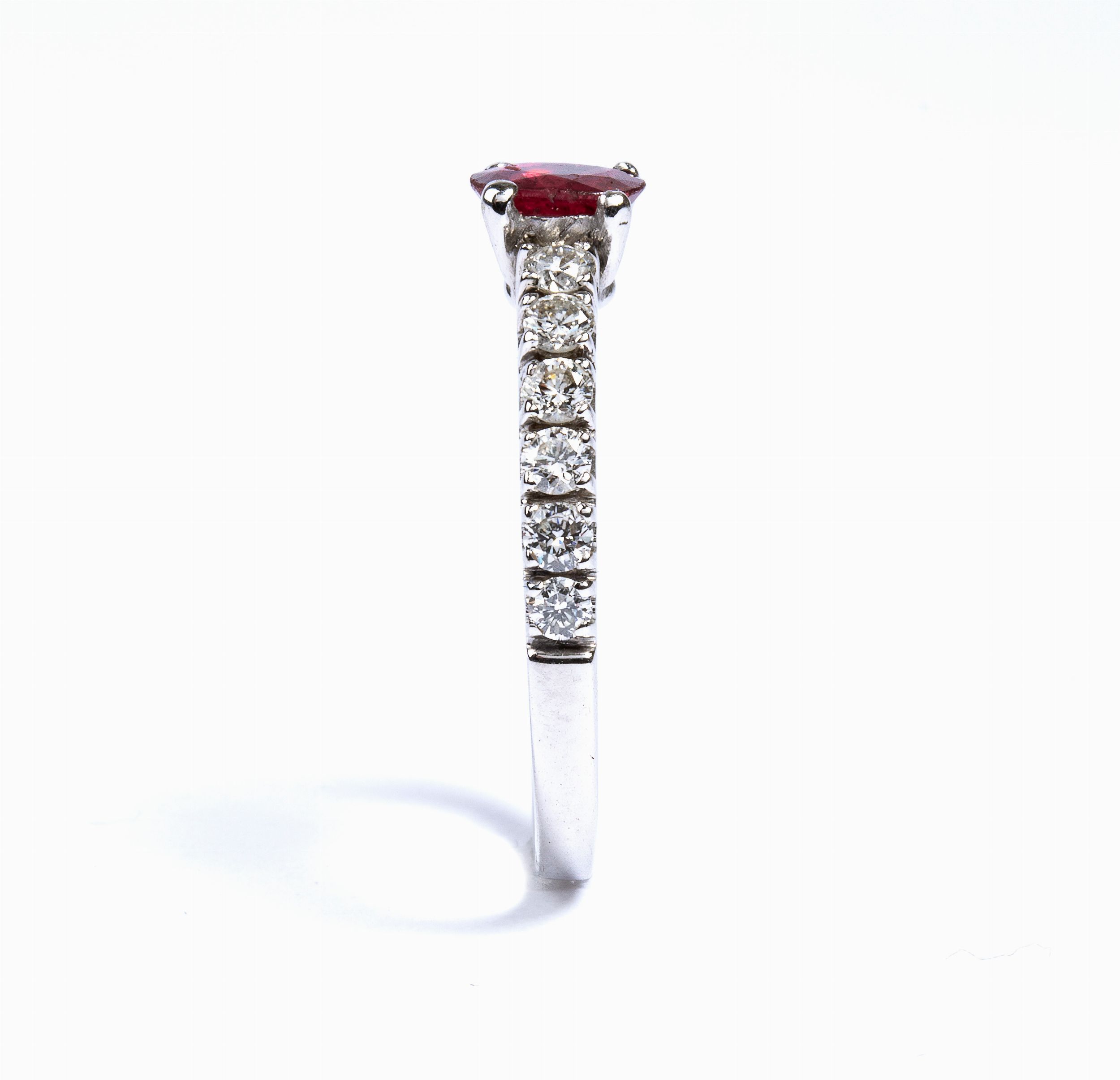 in oro bianco 18k, impreziosito da n. 01 rubino centrale e n. 12 diamanti di forma rotonda, taglio brillante, circa 0.50 ct. Punzonato '750'. Misura ITA 13 - Misura USA 6.  Peso: 2,2 gr.