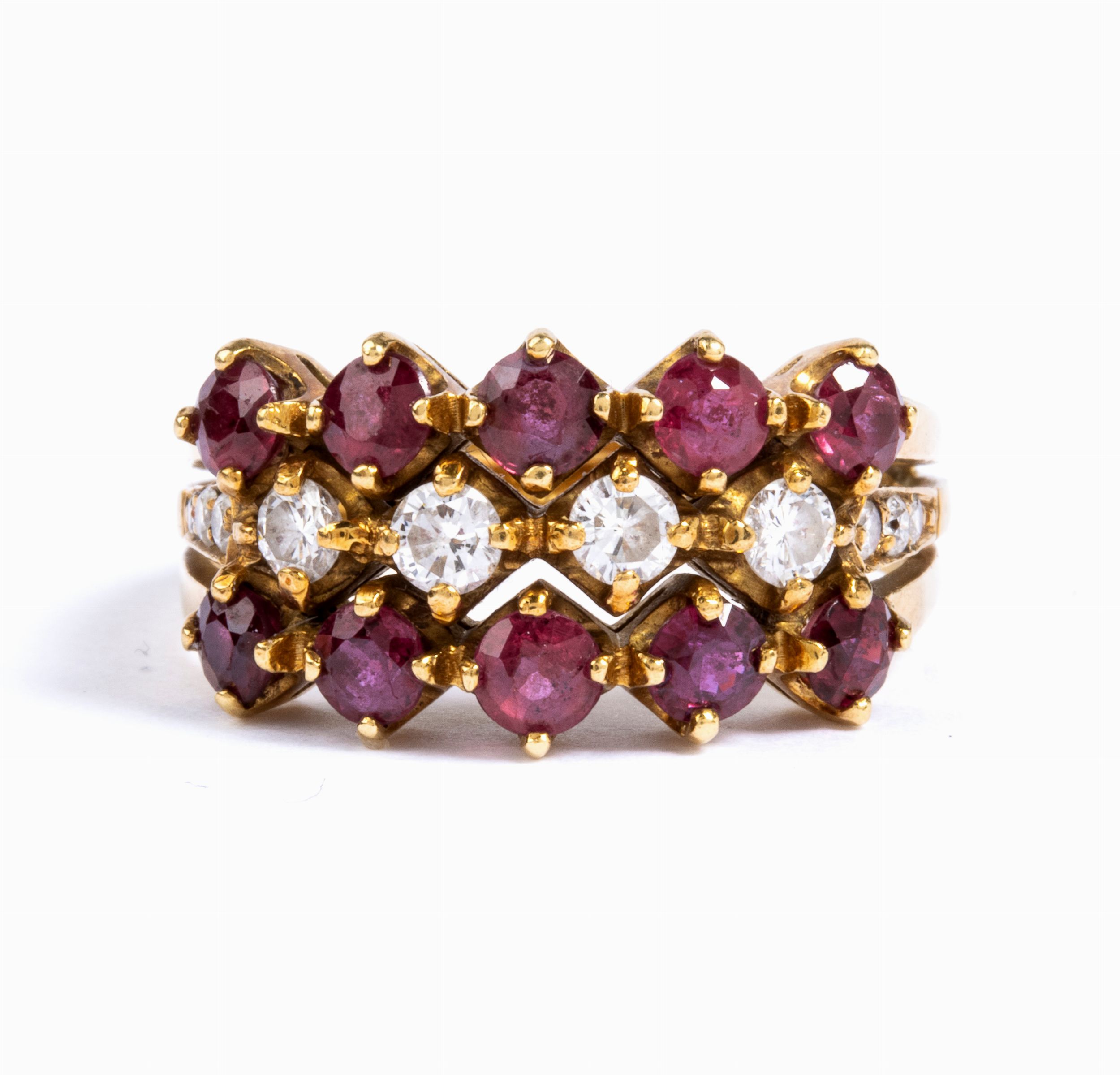 oro giallo 18k, incastonato con linea di diamanti taglio brillante affiancata da due file di rubini rotondi. N. 10 diamanti stimati per un peso totale di circa 0.50 ct, colore G- H, purezza VVS-VS e n. 10 rubini per un peso totale di circa 1.50 ct, come misurati e classificati nella montatura. Punzonato “750”. Misura IT 18 - Misura US 8 ½. Peso: 6,1 gr.