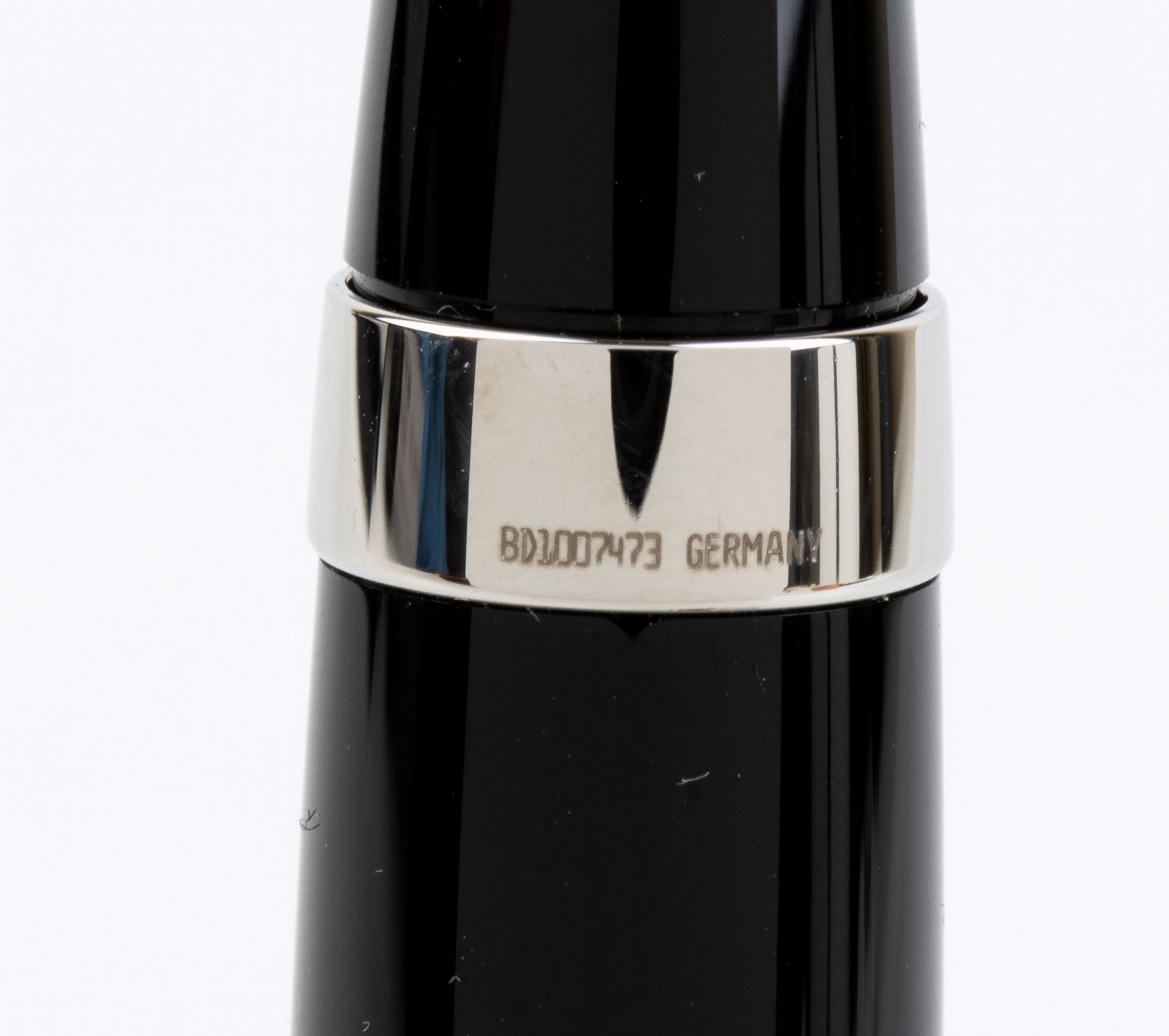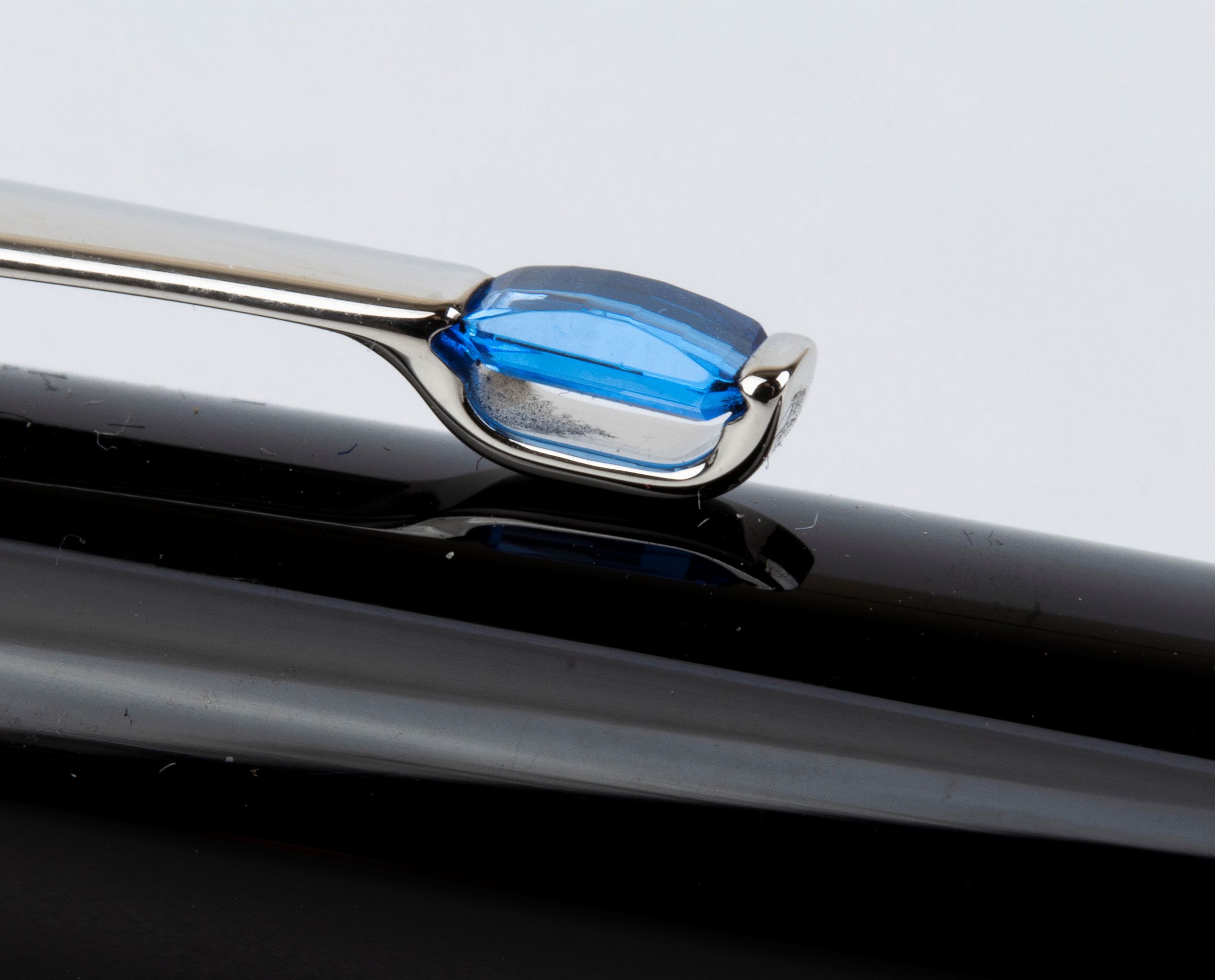 Corpo in pregiata resina nera con finiture in acciaio impreziosite da un topazio blu sulla clip, stella bianca Montblanc intarsiata. Scatola, controscatola e documenti Montblanc. Numero BD1007473 GERMANY. Lunghezza 11 cm . Peso 23,6 gr.