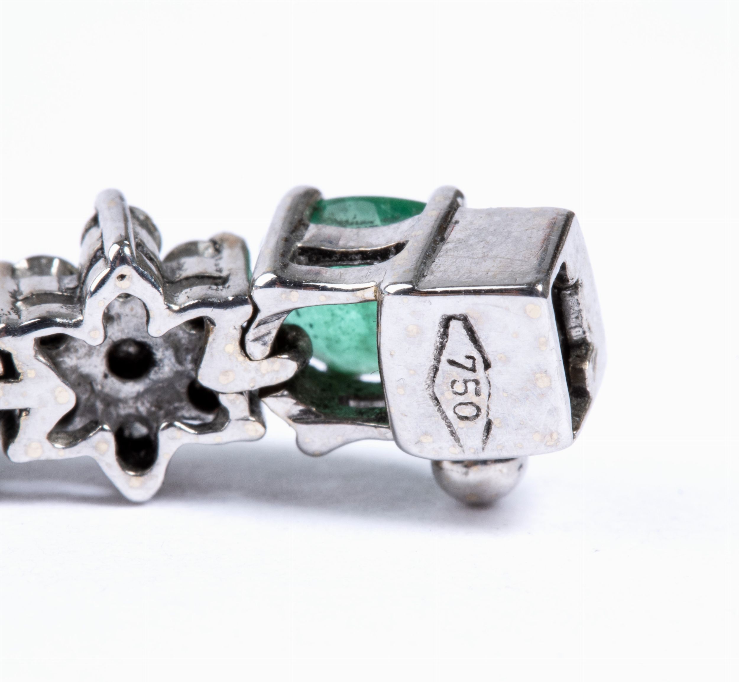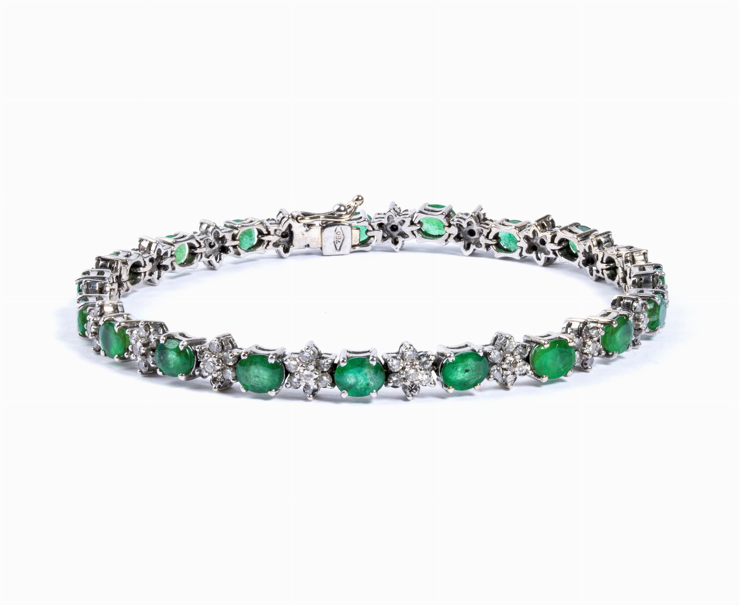 in oro bianco 18k, incastonato con linea di smeraldi ovali separati da motivi a fiore in diamanti rotondi taglio brillante. N. 133 diamanti stimati per un peso totale di circa 2.70 ct, colore H, purezza V. N. 19 smeraldi per un peso totale di circa 6.00 ct, come misurati e classificati nella montatura. Punzonato “750”. Lunghezza: 18.5 cm. Peso: 15,5 gr.