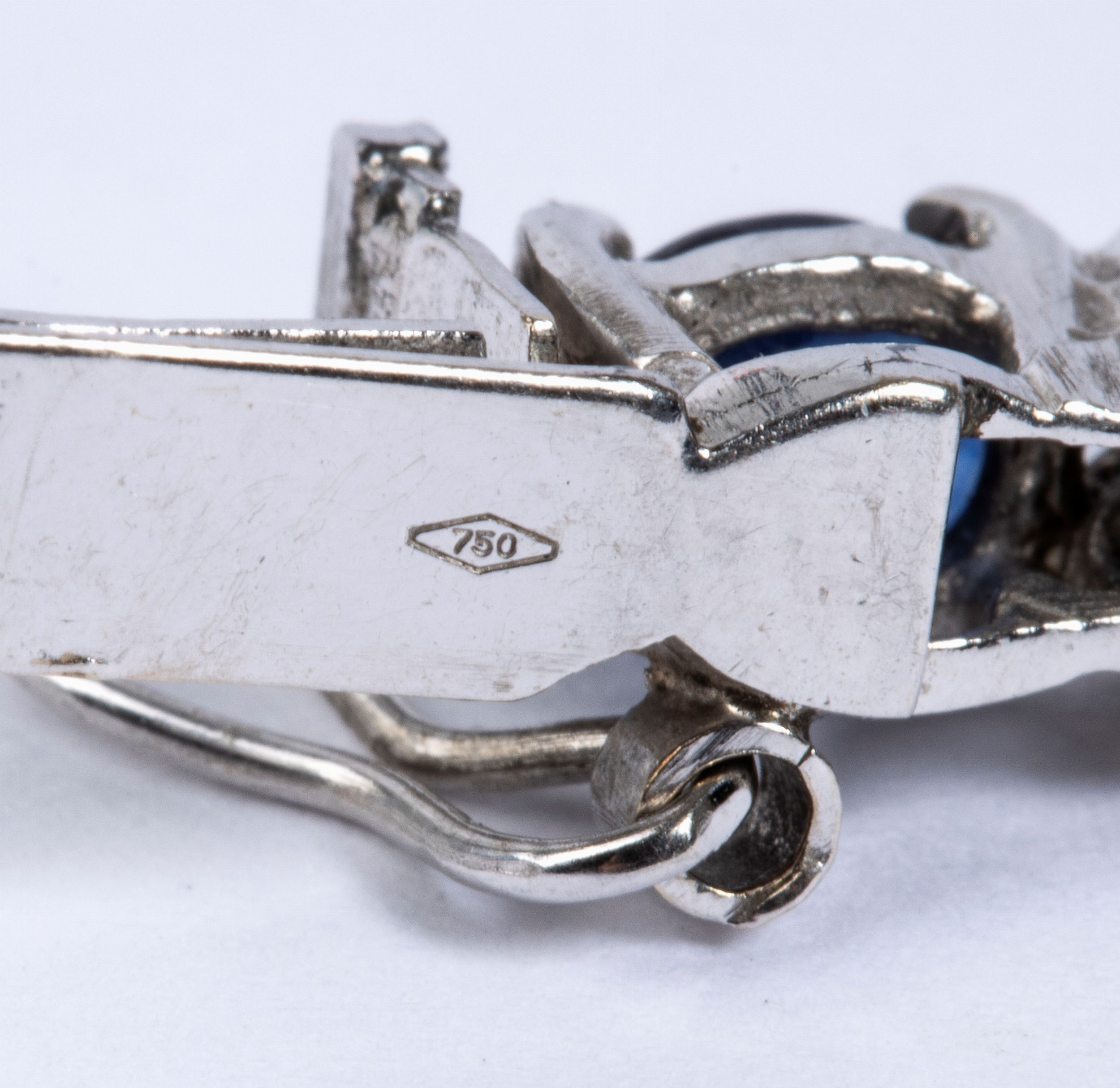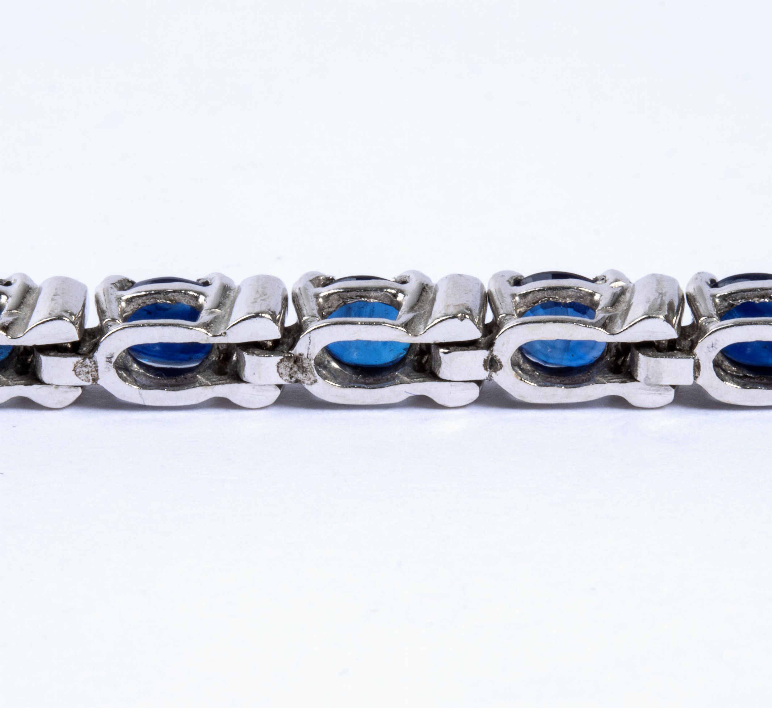 in oro bianco 18k, incastonato con linea di zaffiri ovali separati da coppie di diamanti rotondi taglio brillante. N. 44 diamanti stimati per un peso totale di circa 0.35 ct, colore G- H, purezza VS- SI e n. 22 zaffiri per un peso totale di circa 18.00 ct, come misurati e classificati nella montatura. Punzonato “750”. Lunghezza: 18 cm. Peso: 19,2 gr.