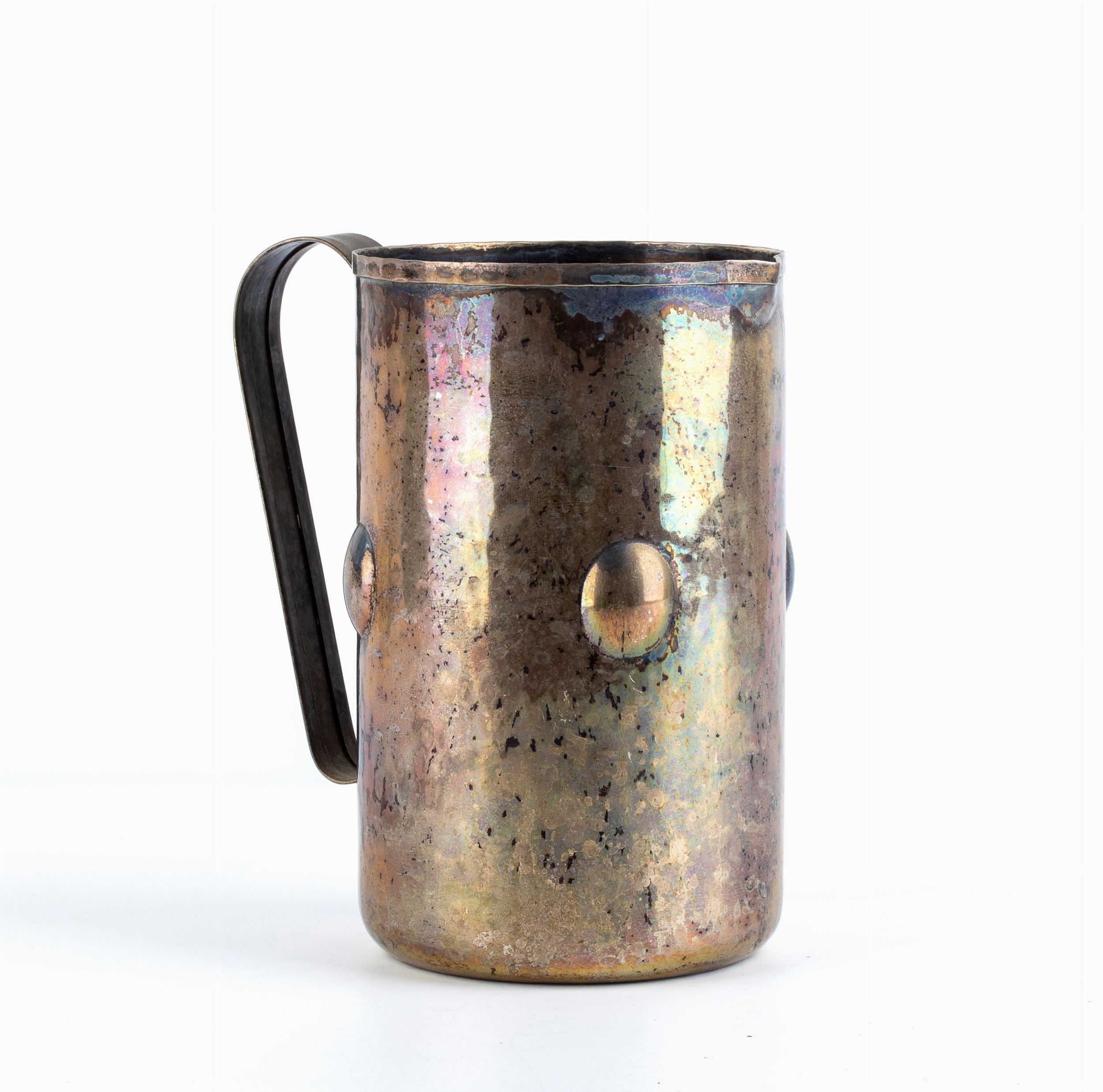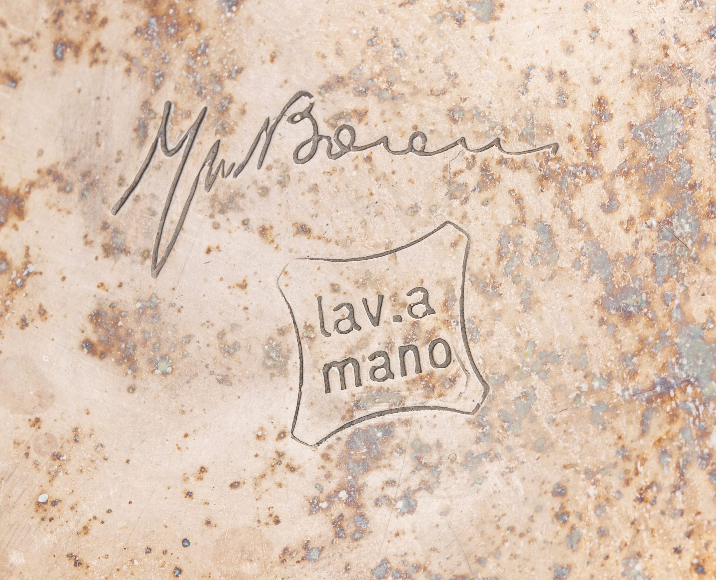 Italia, XX secolo di forma circolare, con manico laterale. Argento 800/1000, punzonata '800 - 76 PD', altro marchio F C non identificato, firmata 'MBereni'.