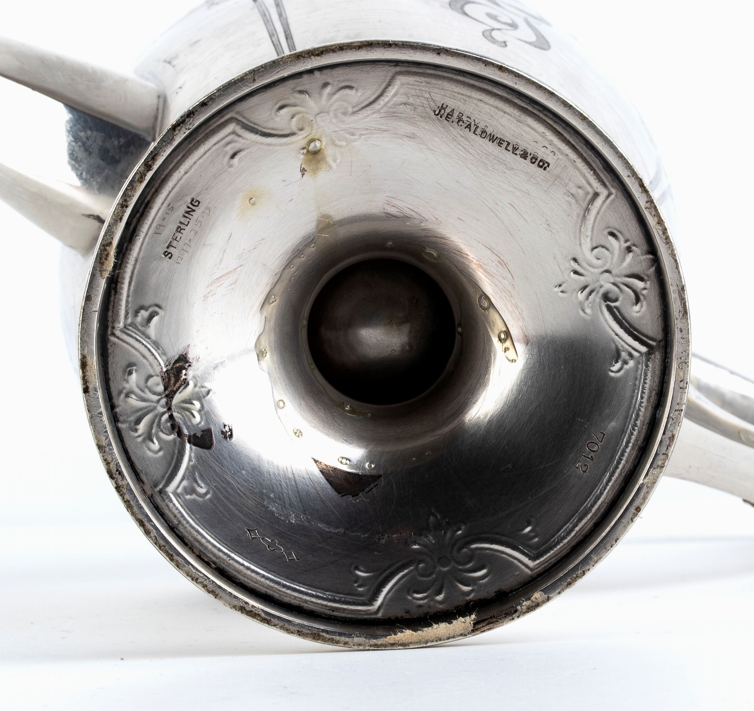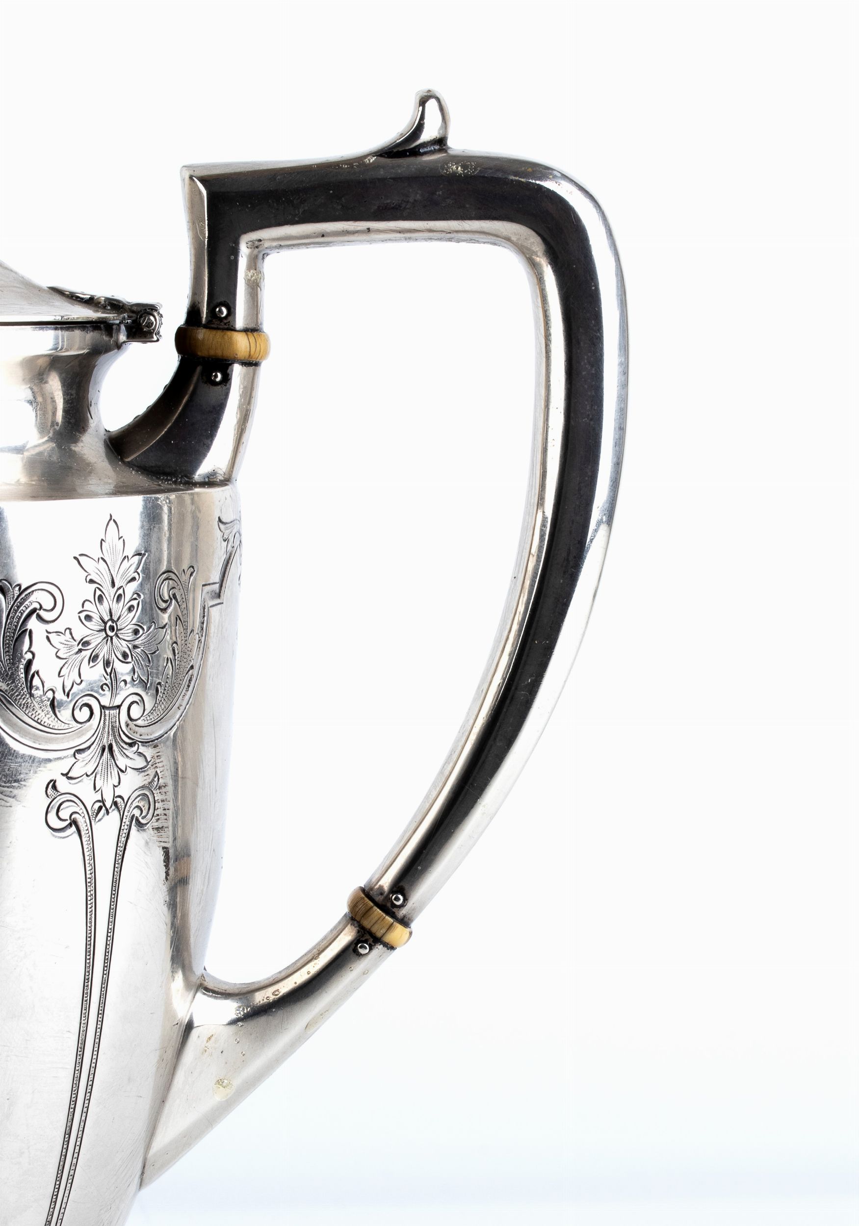 Altezza x larghezza x profondità: 27,5 x 25 x 12 cm. Peso: 595 gr. Philadelphia, 1900 circa corpo ovoidale con decoro a motivi floreali e vegetali, poggiante su piede circolare; collo sagomato con versatoio, coperchio incernierato cimato da una presa geometrica; presenti due distanziatori atermici in osso. Argento 925/1000, punzonata 'STERLING - J.E.CADLWELL & Co.', argentiere J.E.CADLWELL & Co.