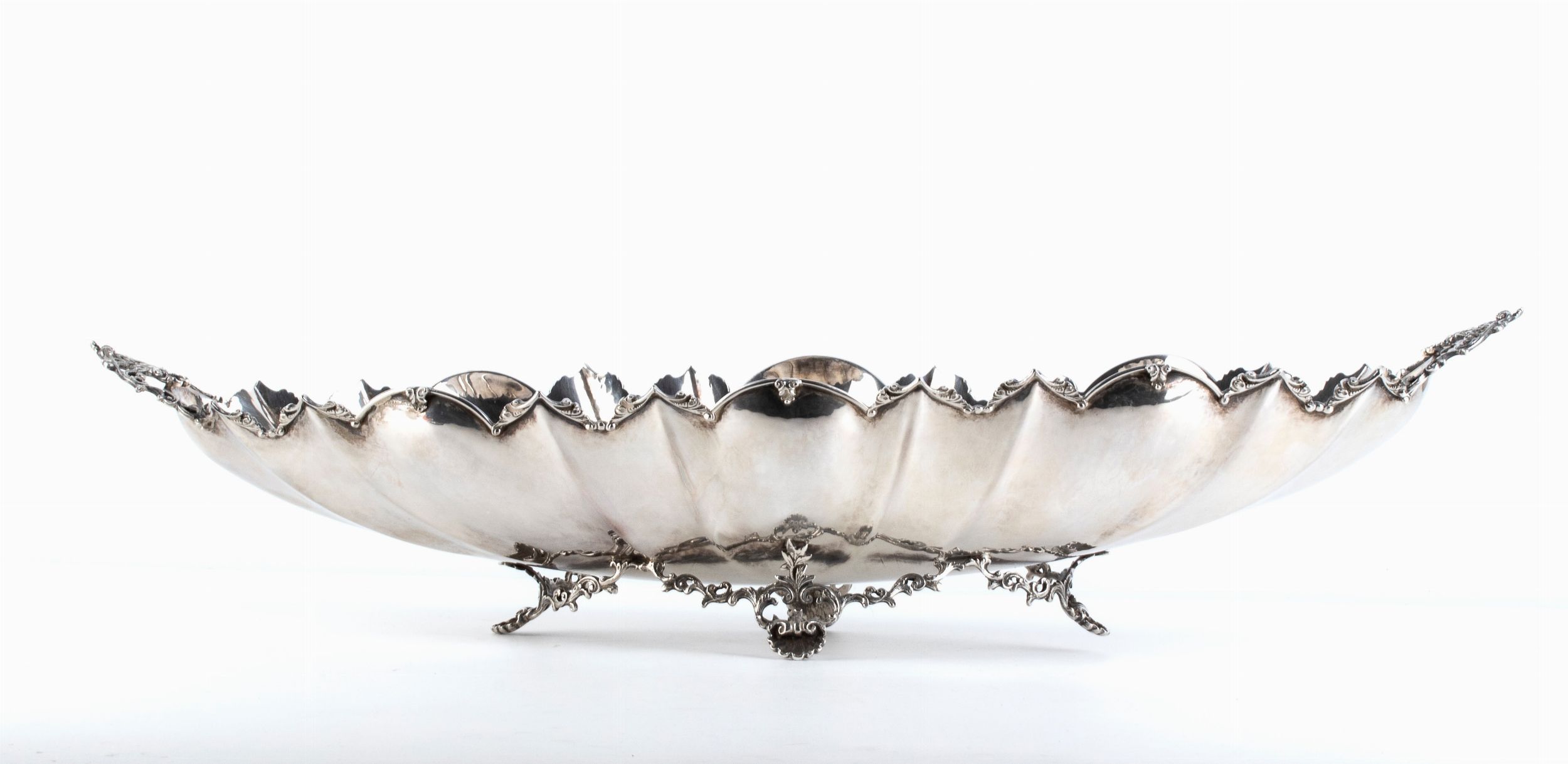 Altezza x larghezza x profondità: 9,5 x 55 x 17,5 cm. Peso: 950 gr Metà XX secolo di forma ovale allungata sagomata, poggiante su piedi a volute fogliate, decorazione presente anche sui manici e sulla bordatura del centrotavola. Argento 800/1000, punzonato '800 - 1 AL', argentiere A. CESA S. C. ora CESA 1882.