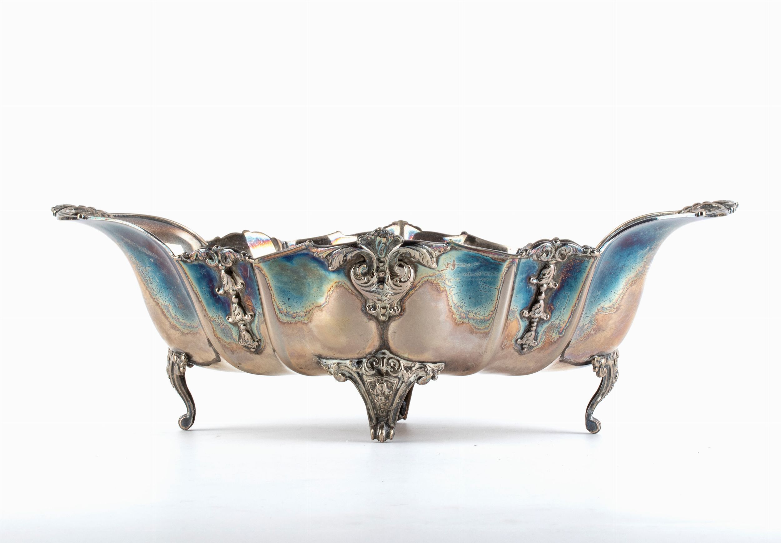 Altezza x larghezza x profondità: 11 x 36,5 x 20 cm. Peso: 851 gr Metà XX secolo di forma ovale con motivi fogliati in rilievo e poggiante su quattro piedini con lo stesso motivo. Argento 800/1000, punzonato '800 - 20 AL', argentiere RICCI & C. S.p.A.