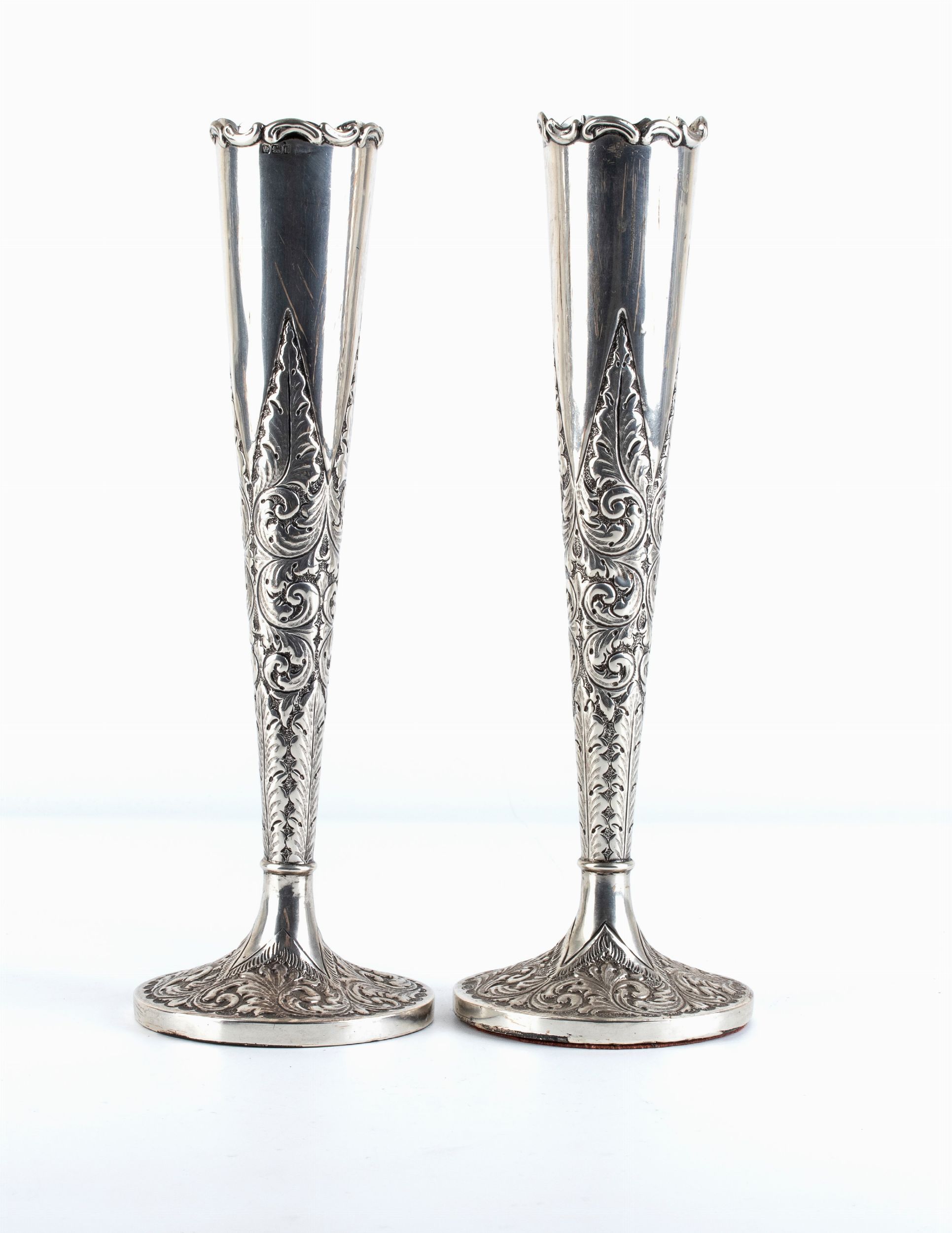 Altezza x larghezza x profondità: 25 x 8,5 x 8,5 cm. Peso: 240 gr circa. Sheffield 1902 di forma troncoconica, poggianti su base circolare, decoratoicon motivi vegetali. Argento 925/1000 con base appesantita, punzonati con la serie completa di marchi Sheffiled 1902-1903, argentiere Walker & Hall.