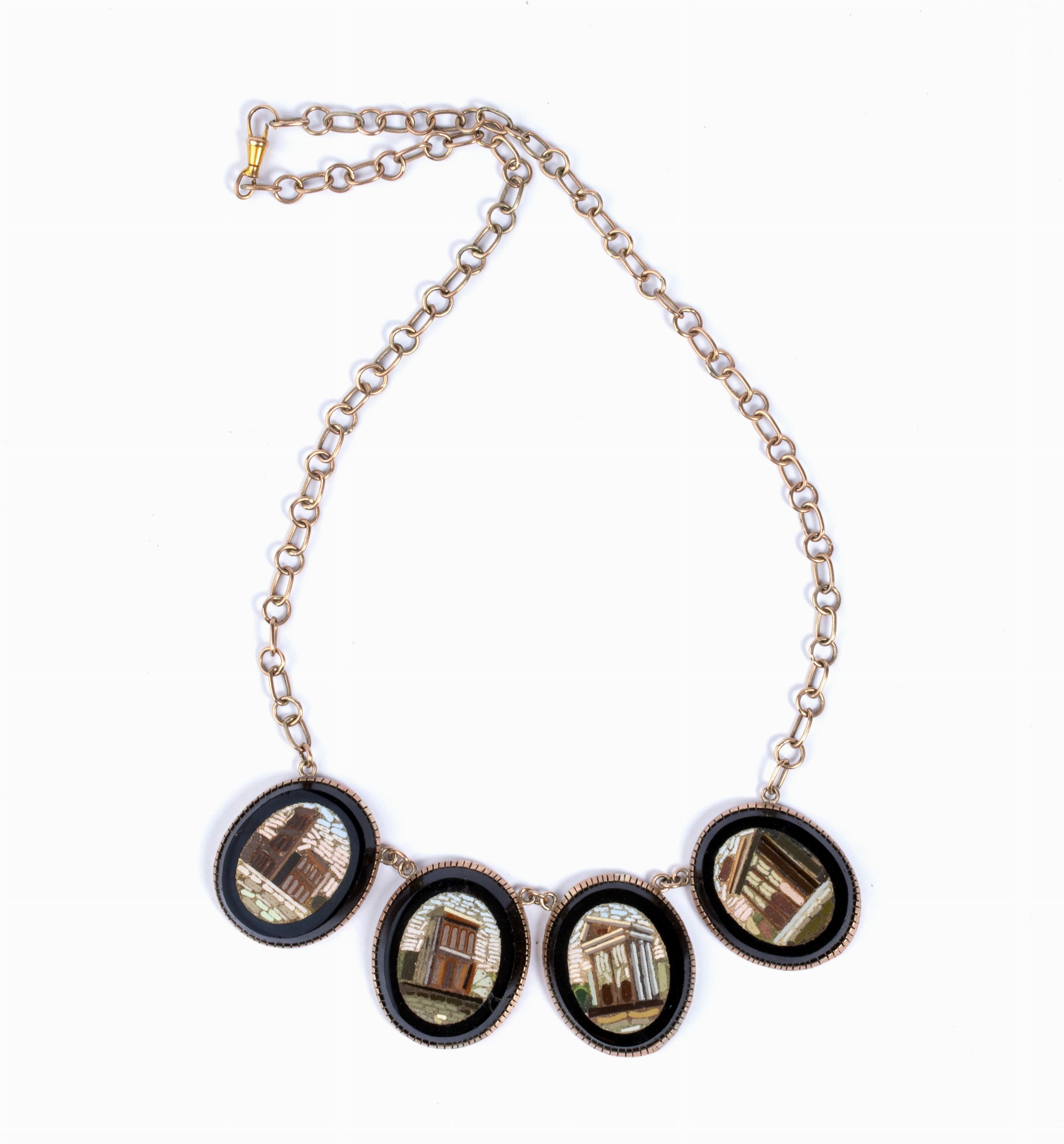 Fine XIX inizio XX secolo con n. 04 micromosaici raffiguranti monumenti, catena a maglie rolḷ. Chiusura a moschettone. Dimensioni micromosaici: 3 x 2,2 cm. Lunghezza girocollo: 42 cm. Peso: 36 gr.