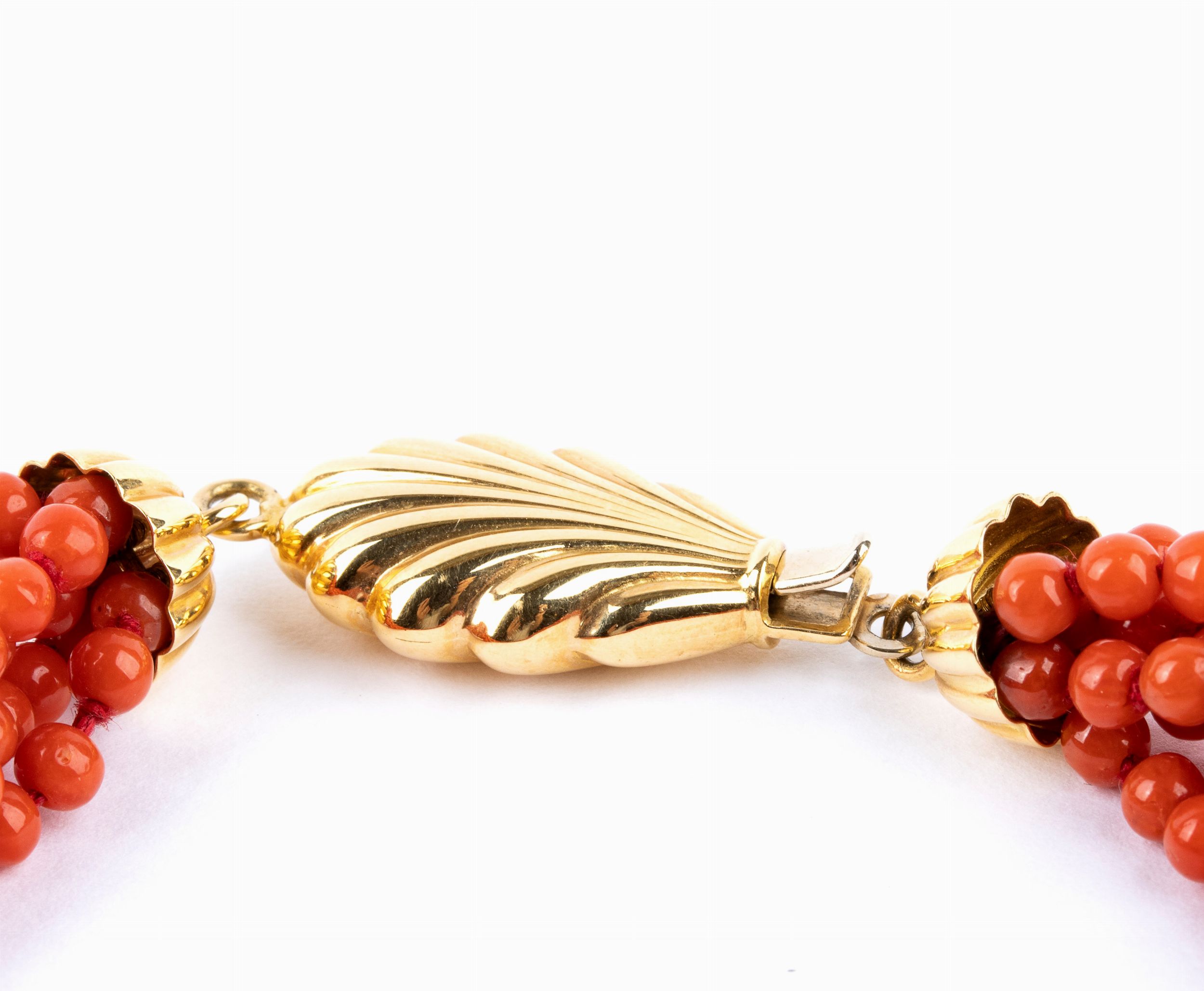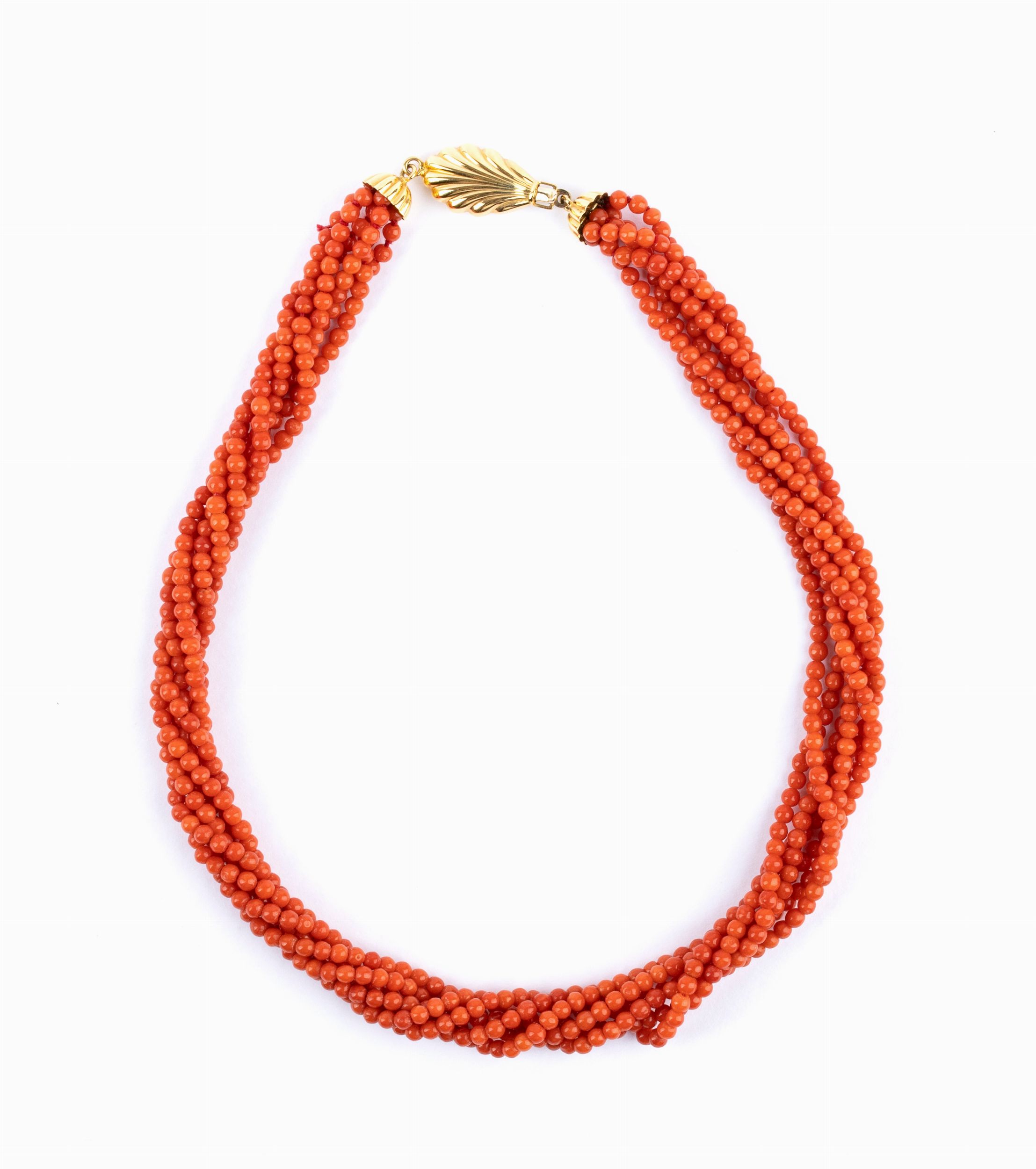 a sei fili di piccole sere di corallo Mediterraneo (corallium rubrum) con fermezza a forma di foglia in oro giallo 18k. Punzonata “750 – 493 VI”. Diametro sfere di corallo: 3.5 - 4 mm. Lunghezza girocollo: 43,5 cm Peso: 49,1 gr.