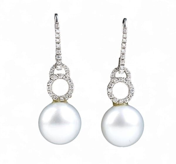 in oro bianco 18k, impreziositi da diamanti e perle Australiane. N. 54 diamanti di forma rotonda, taglio brillante, circa 0.60 ct, F-G, VVS-VS. Diametro perle 13.5 - 14 mm. Punzonato '750 - 218 PA'. Lunghezza: 4 cm. Peso complessivo: 12,5 gr.