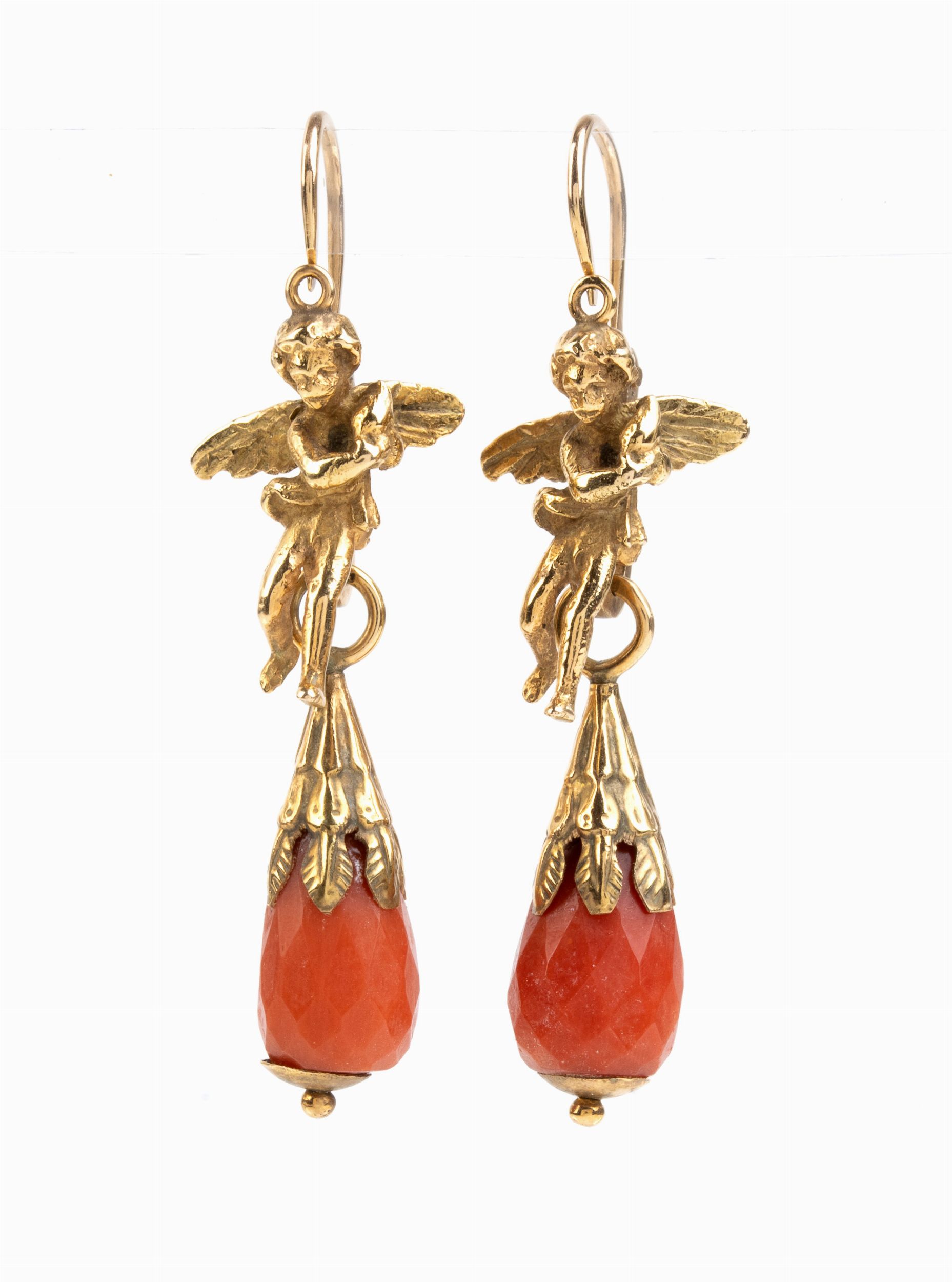 ciascuno con montatura in oro basso raffigurante un piccolo cherubino che sormonta una goccia pendente di corallo Mediterraneo (corallium rubrum) .  Punzonato '500'. Lunghezza 5 cm. Peso complessivo 10,2 gr.