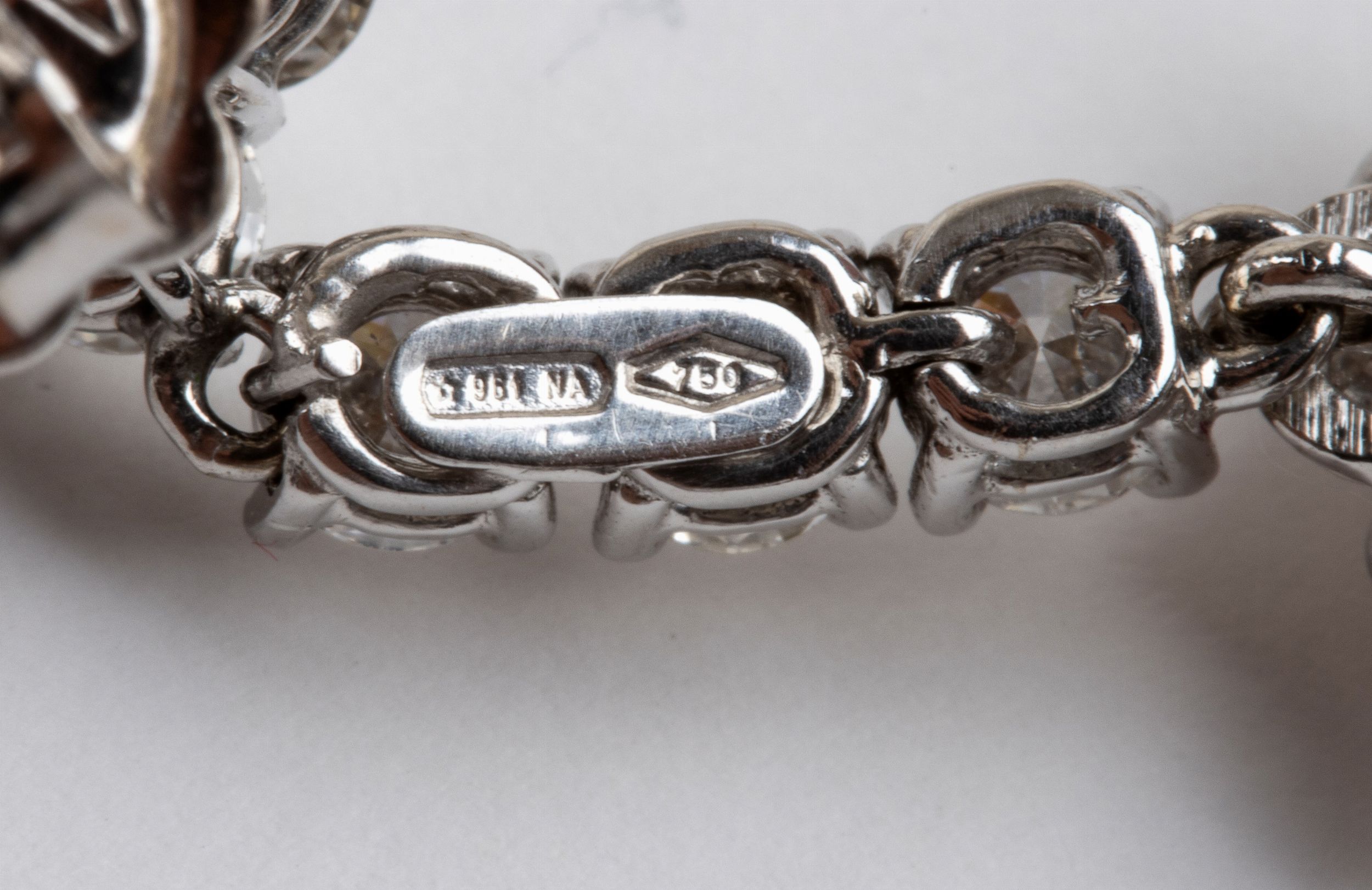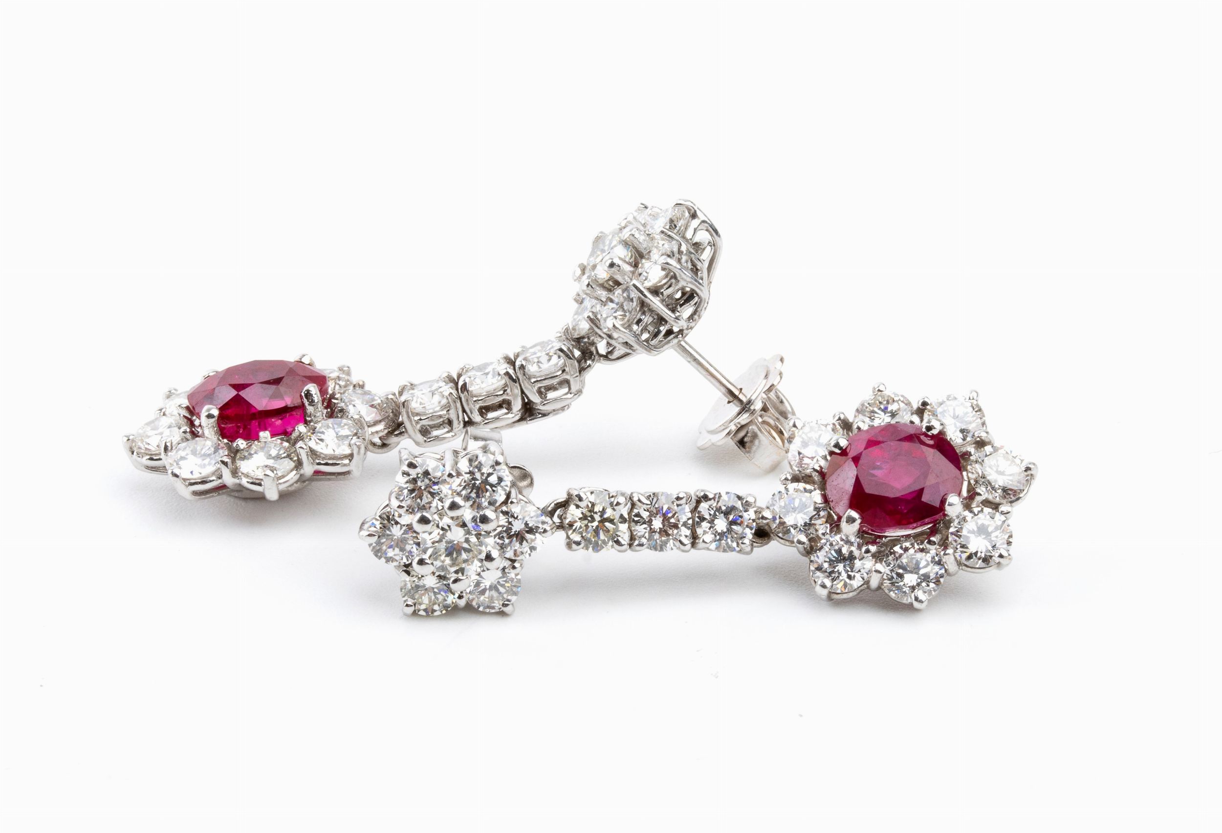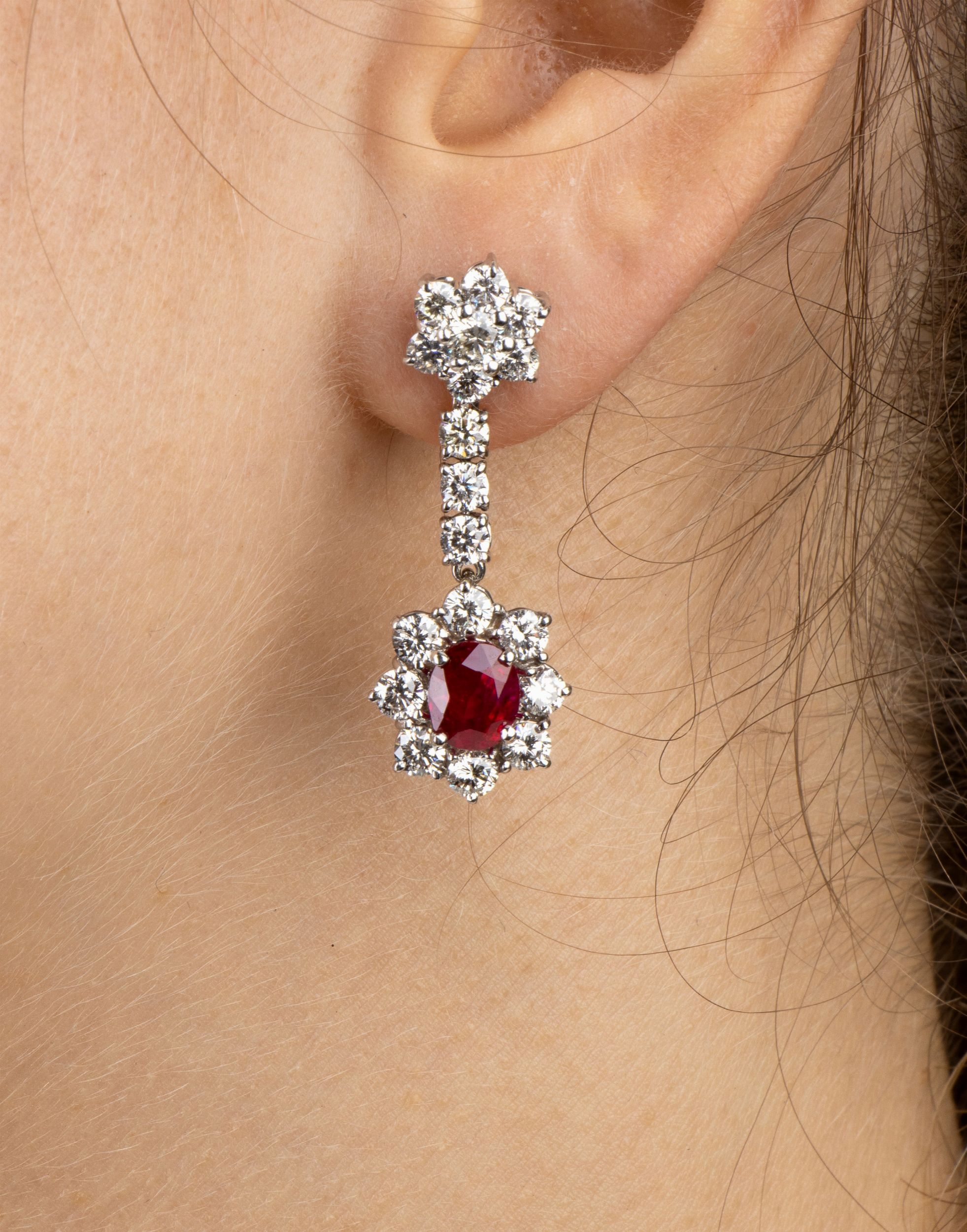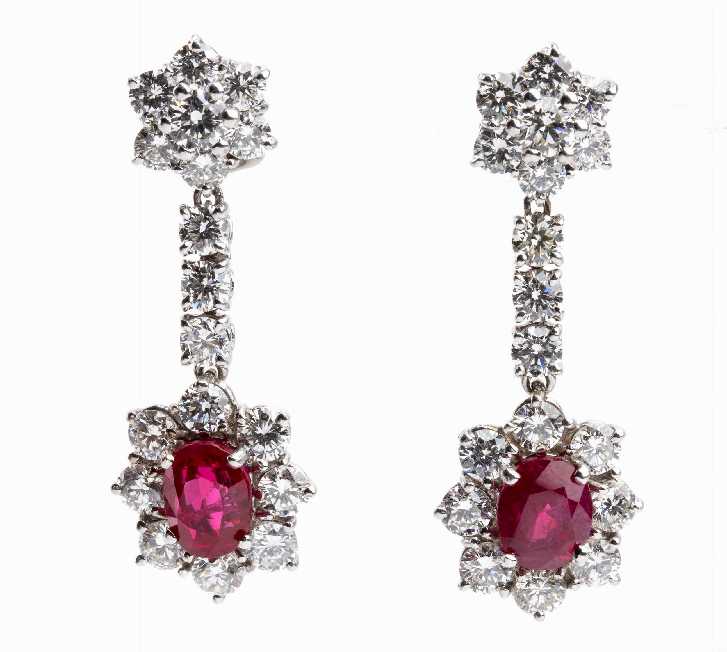 Italia in oro bianco 18k, ciascuno impreziosito da rubino contornato e sormontato da diamanti. N. 02 rubini di forma ovale, taglio composito, circa 4.00 ct. N. 36 diamanti di forma rotonda, taglio brillante, circa 4.80 ct, G-H, IF-VVS. Punzonati '750 - 961 NA'. Lunghezza 3,5 cm. Peso complessivo 9,9 gr.