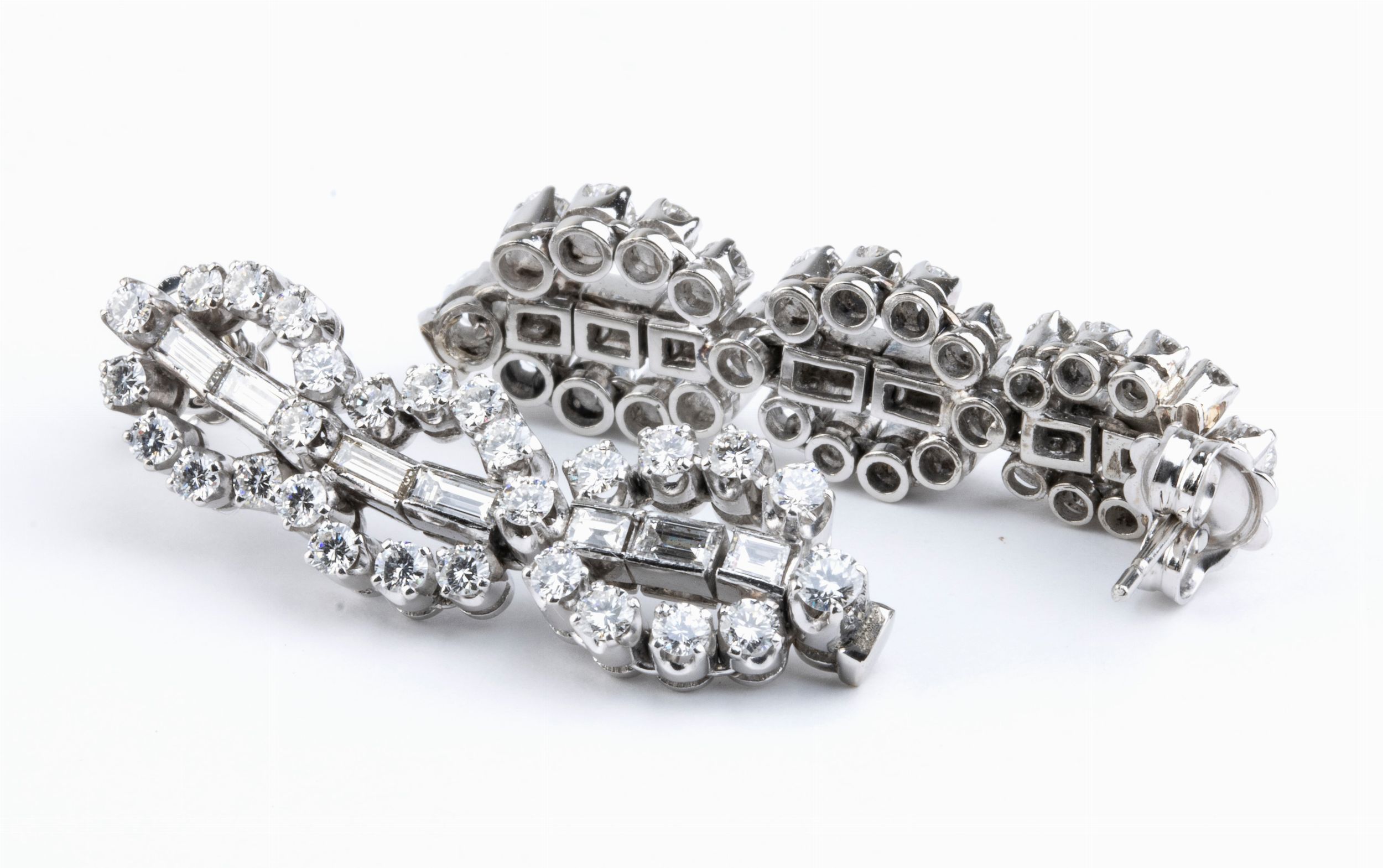 montatura in platino impreziosita da diamanti. Chiusura in oro bianco con perno. N. 56 diamanti di forma rotonda, taglio brillante e n. 14 diamanti di forma rettangolare, taglio a gradini, circa 3.50 ct totali, E-F, VVS. Punzonati '750'. Lunghezza 37 mm. Peso 15.9 gr.