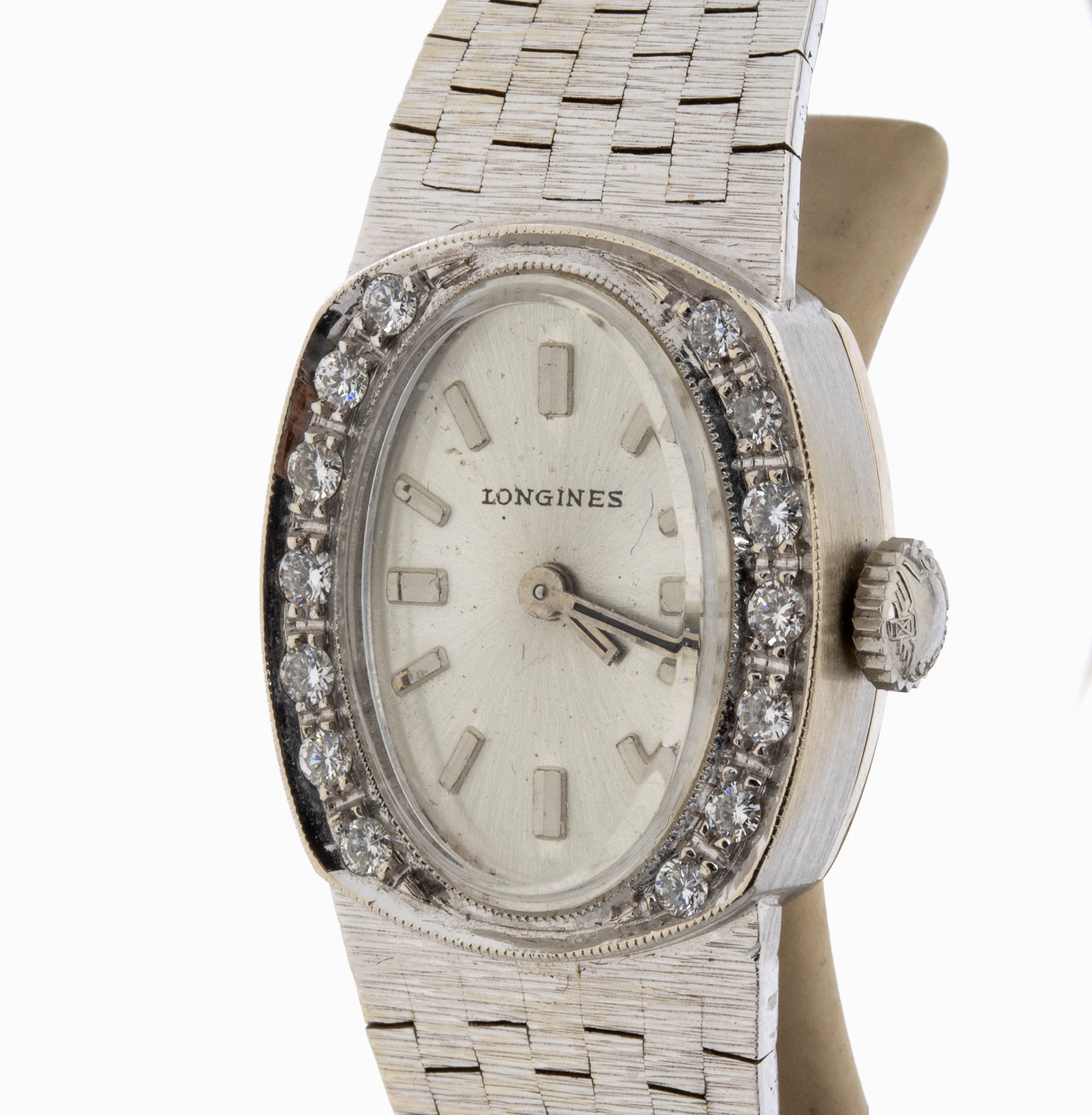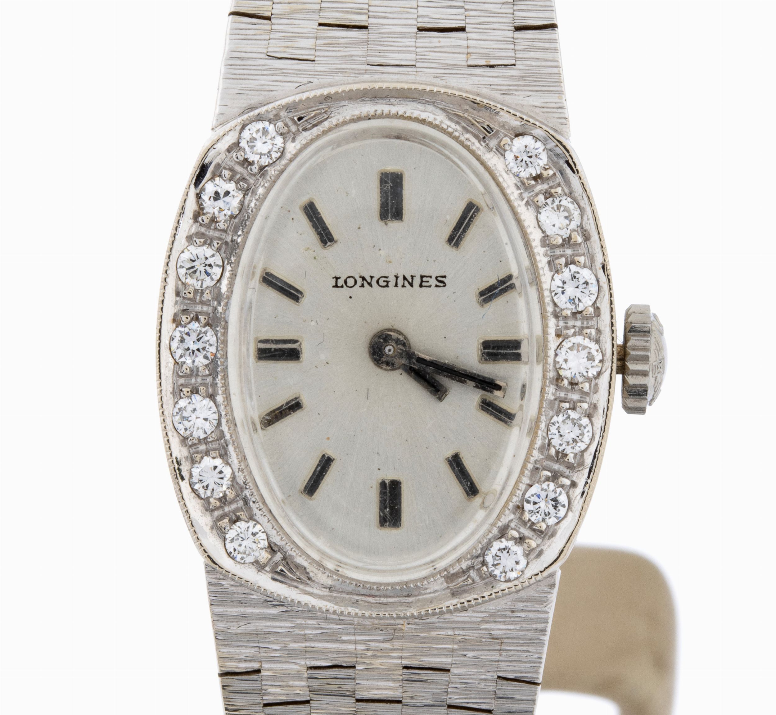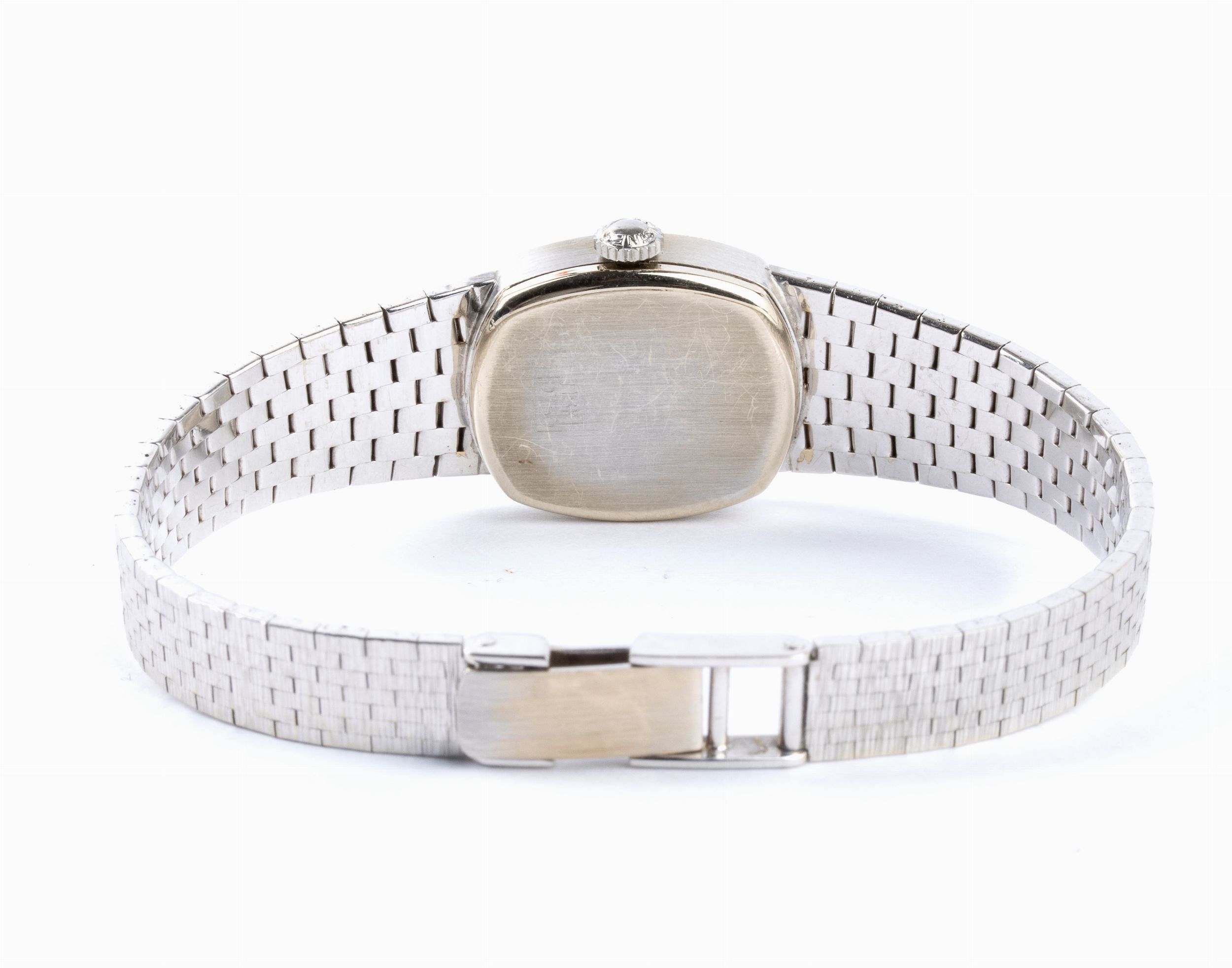 cassa in oro bianco 18k, cinturino a maglie satinate, indici a bastoni, quadrante argentè circondato da n. 14 diamanti di forma rotonda, taglio brillante. Dimensione cassa: 2 x 2,2 cm. Peso lordo complessivo: 38,8 gr.