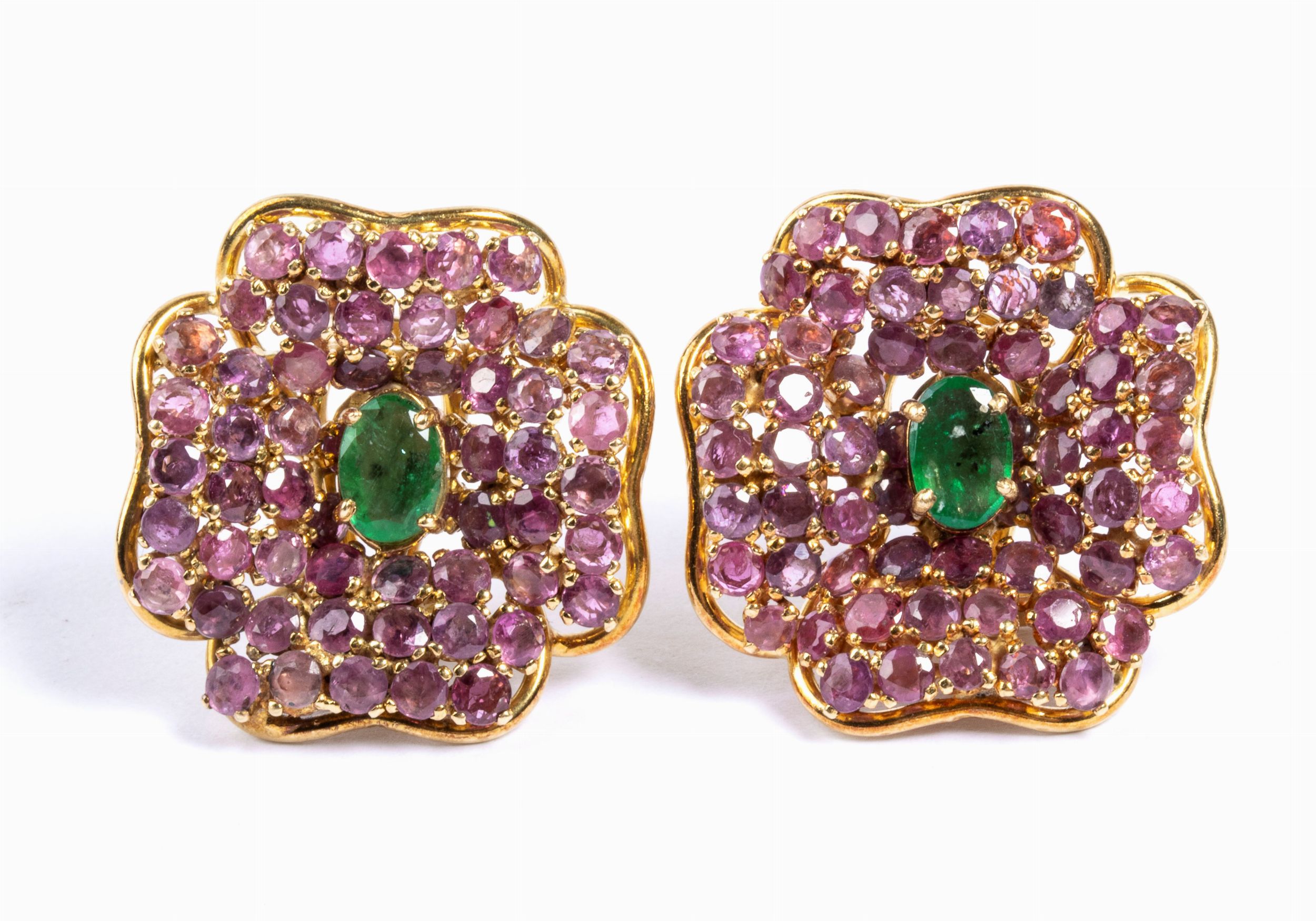 Paio di orecchini a fiore in oro con rubini e smeraldi