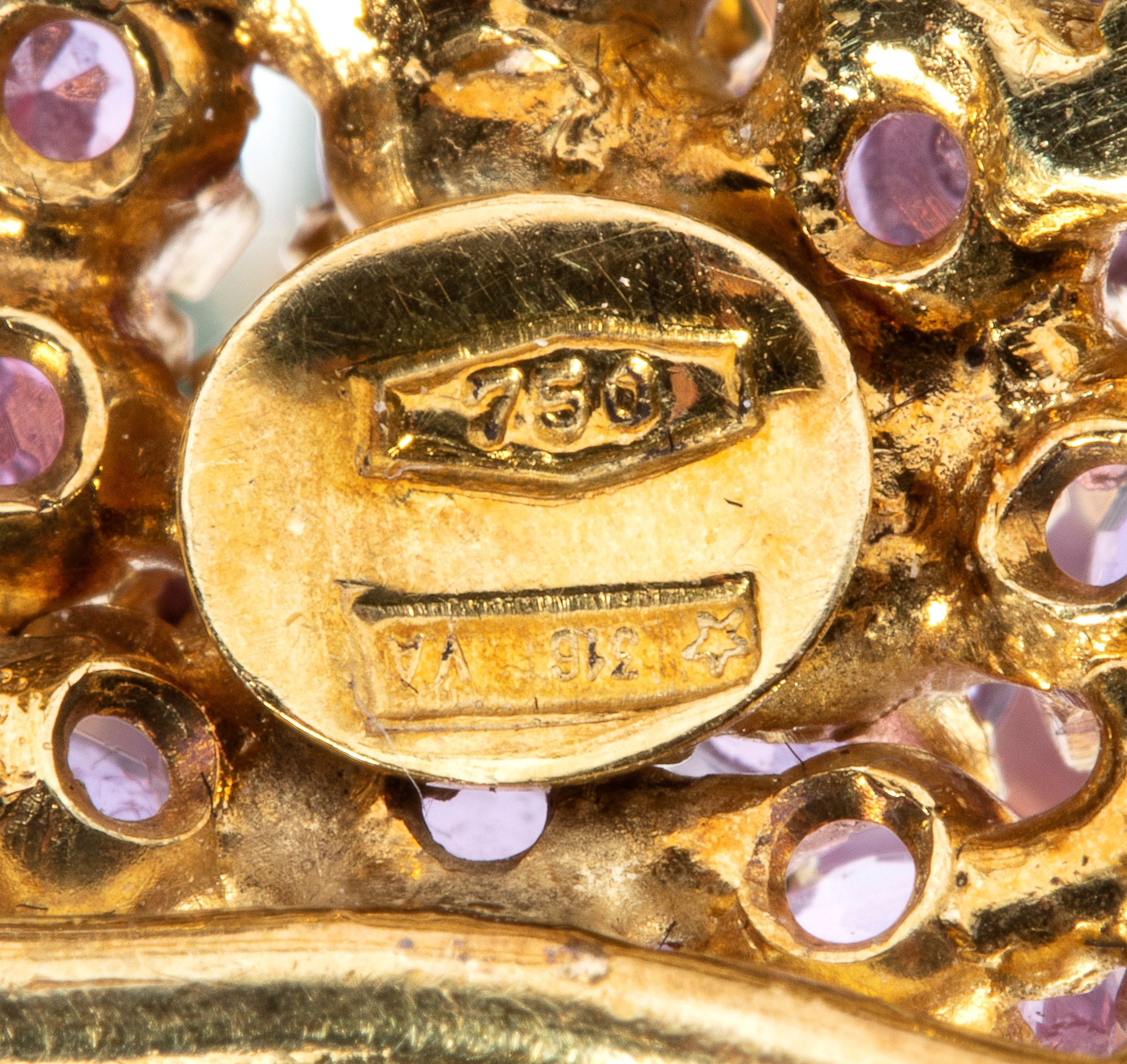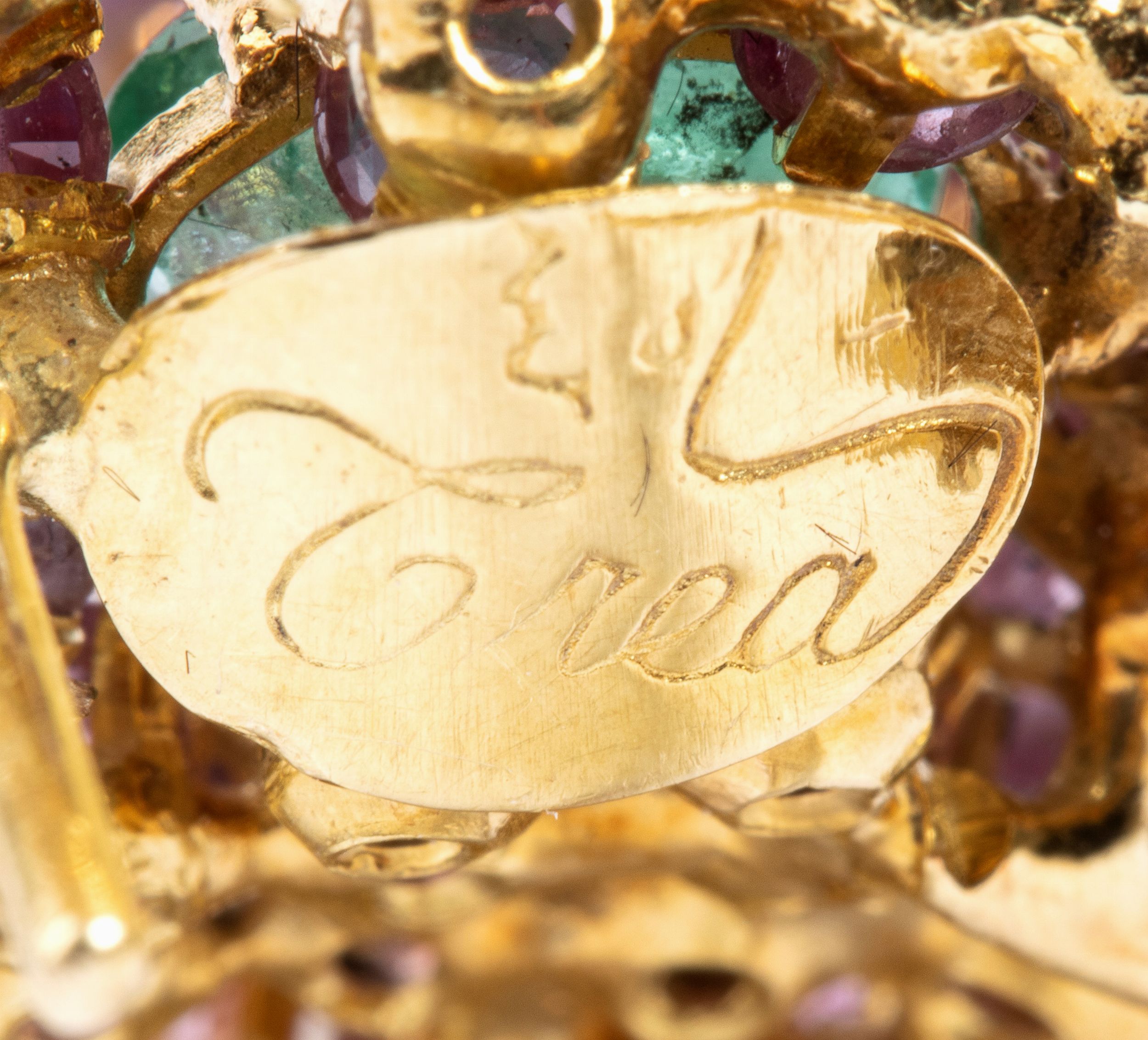 in oro giallo 18k, ciascuno incastonato al centro con smeraldo ovale tra petali in avé di rubini rotondi. N. 02 smeraldi per un peso totale di circa 1.20 ct. N. 60 rubini per un peso totale di circa 8.00 ct, come misurati e classificati nella montatura. Punzonato “750 – 216 VA”, firmati TREA. Peso: 20,5 gr.