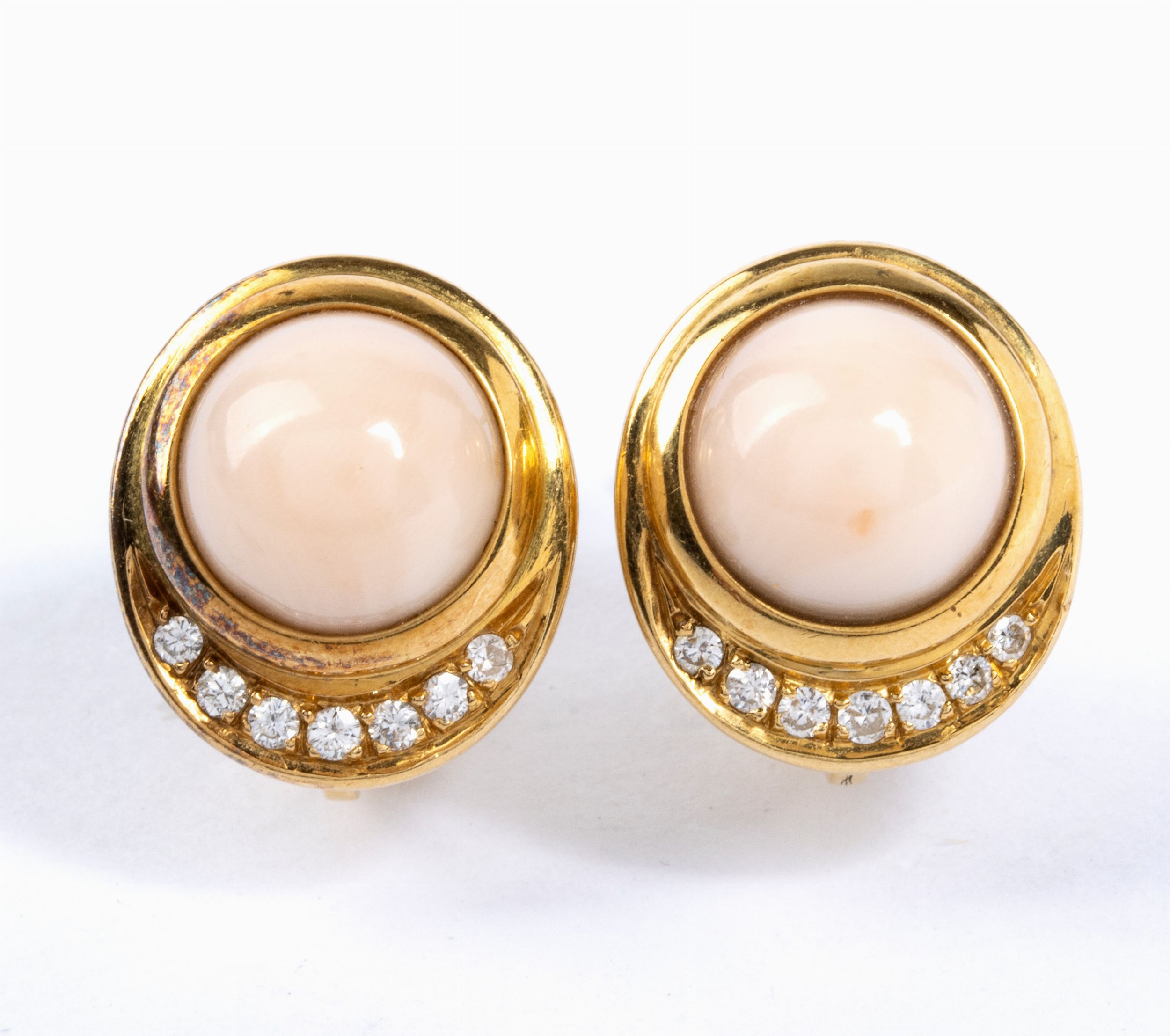 ciascuno con cabochon di corallo Deep Sea (corallium sp.nov.), dettagli in diamanti taglio brillanti. N. 14 diamanti stimati per un peso totale di circa 0.28 ct, colore G-H, purezza VS- SI, come misurati e classificati nella montatura. Dimensioni: 2 x 1,6 cm. Peso: 11,8 gr.
