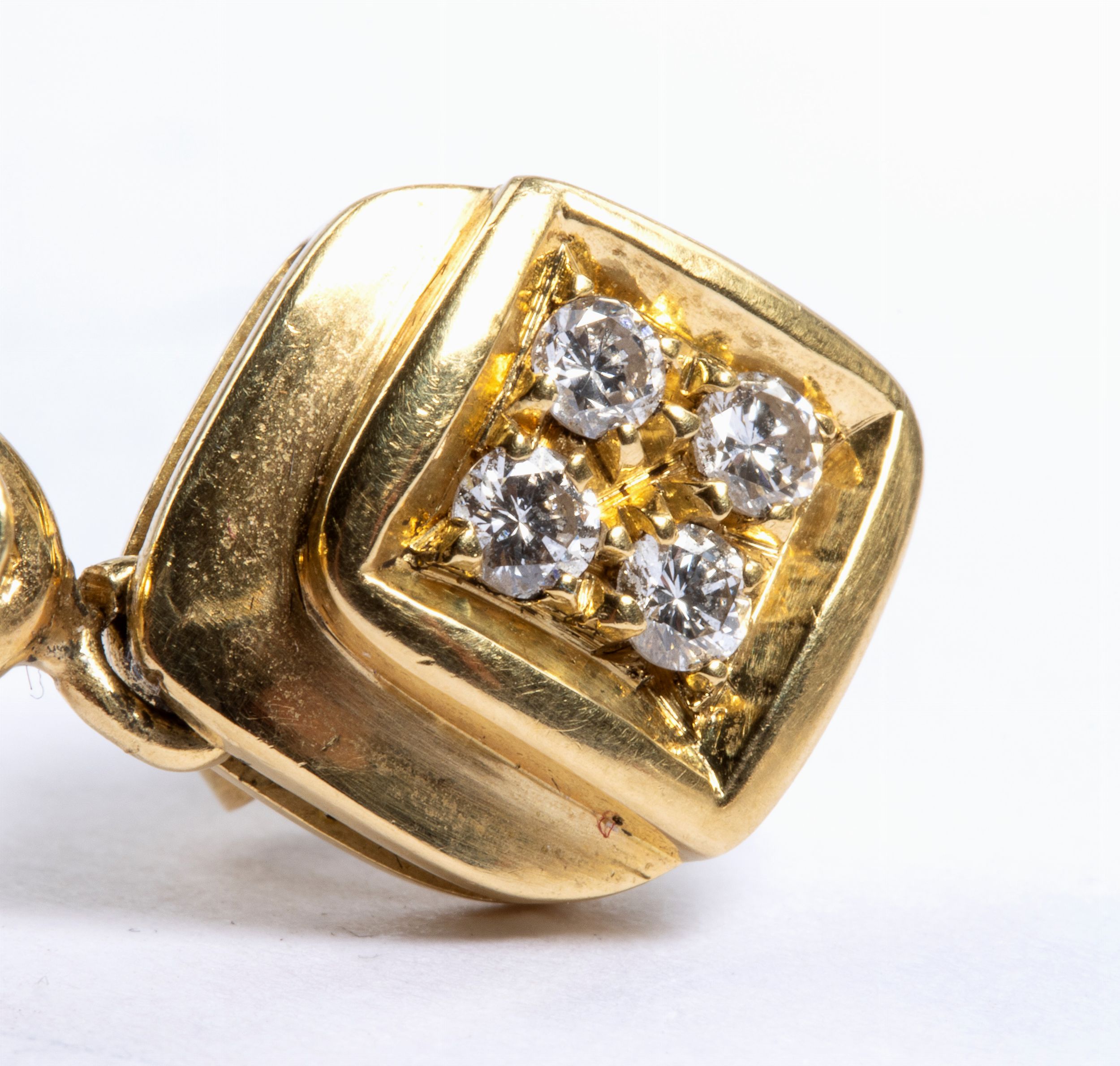 in oro giallo 18k, ciascuno con goccia di corallo cerasuolo (corallium elatius) sormontata da diamanti taglio brillante. N. 16 diamanti stimati per un peso totale di circa 0.50 ct, colore H, purezza VS, come misurati e classificati nella montatura. Lunghezza 4,3 cm. Peso 17,9 gr.